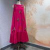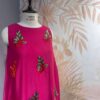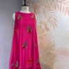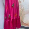 This dress is a vibrant and stylish sleeveless A-line flared outfit in a bold fuchsia pink shade. It features colorful floral embroidery with red and orange flowers and green leaves, scattered across the front, adding a lively and traditional touch. The fabric appears to be lightweight and flowy, ideal for casual or festive summer occasions. The hemline is finished with a broad ruffled border, enhancing the dress’s playful and breezy aesthetic.