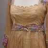 A graceful Pure Tissue Anarkali crafted in a soft, flowing silhouette. The yoke and waistline are highlighted with delicate multi-colour thread embroidery, extending subtly onto the sleeves for an elegant finish. The ensemble is paired with a matching Tissue Dupatta adorned with classic polka dots and scalloped edging, adding charm and lightness to the look. Completing the set are sleek Mashru Satin pants, giving the outfit a rich, contemporary touch.”