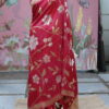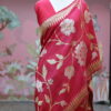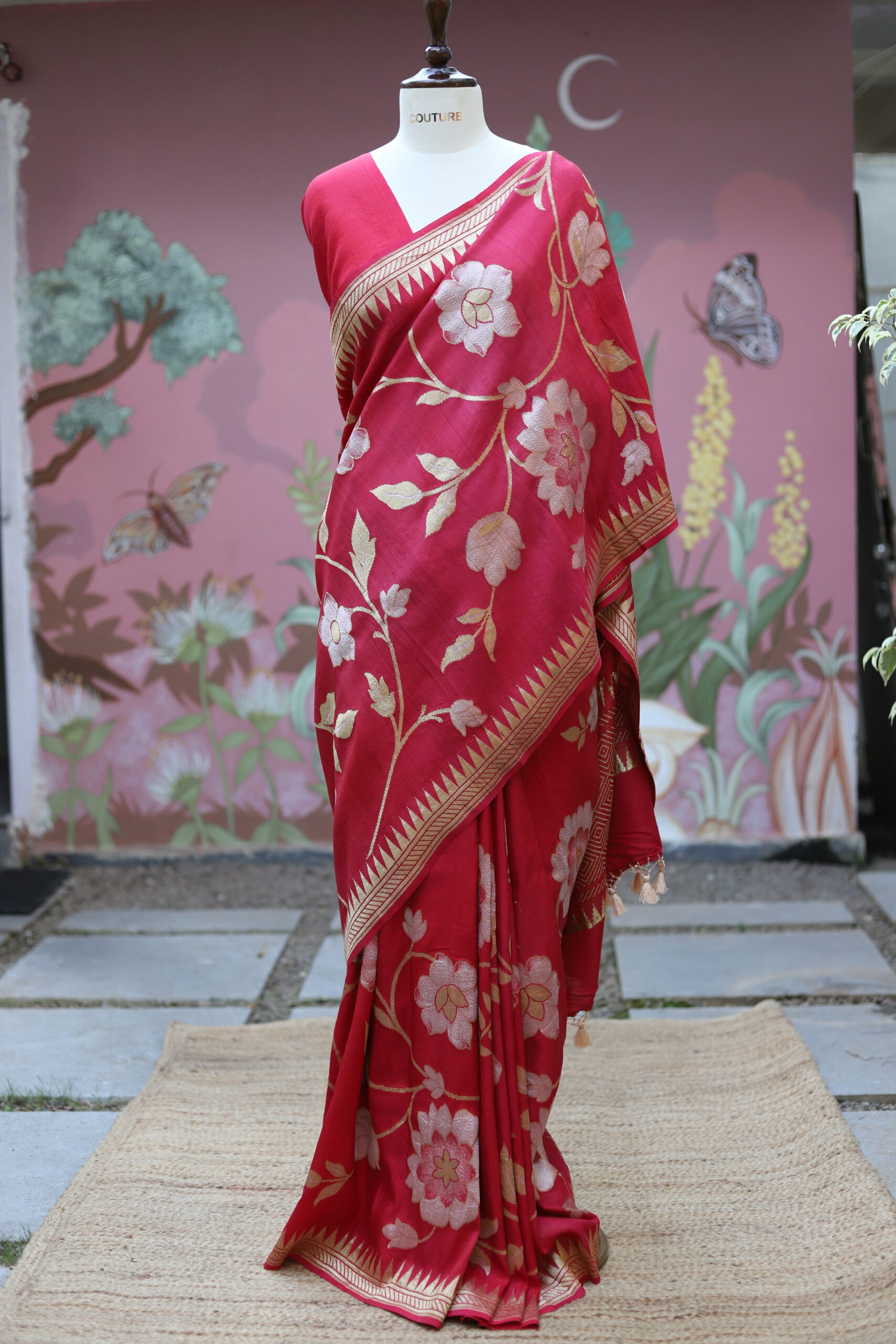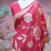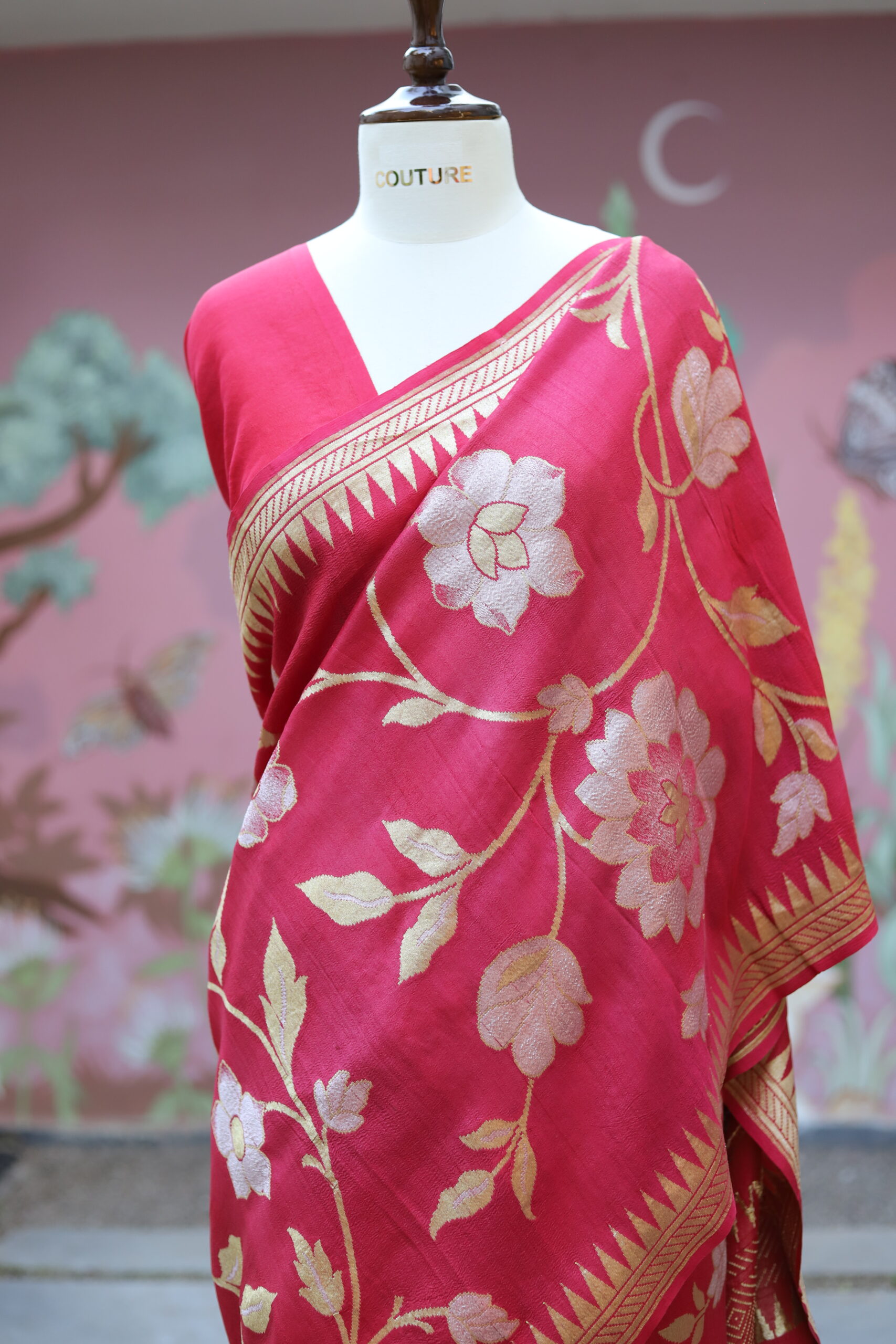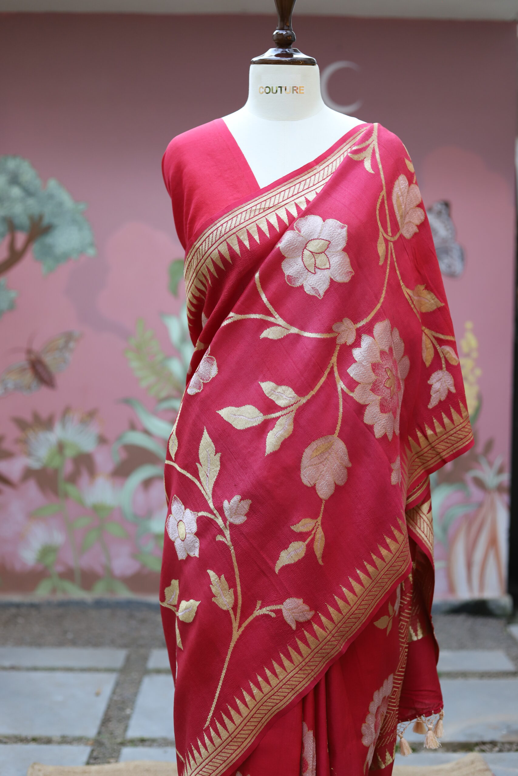 Pure tussar silk saree intricately woven with allover meenakari detailing in mixed gold and silver zari. The saree features an elegant mountain-inspired design along the edges, adding a rich traditional touch. The blouse comes in plain tussar silk with a delicate zari border for the sleeves. Perfect choice for weddings, festive occasions, and poojas.