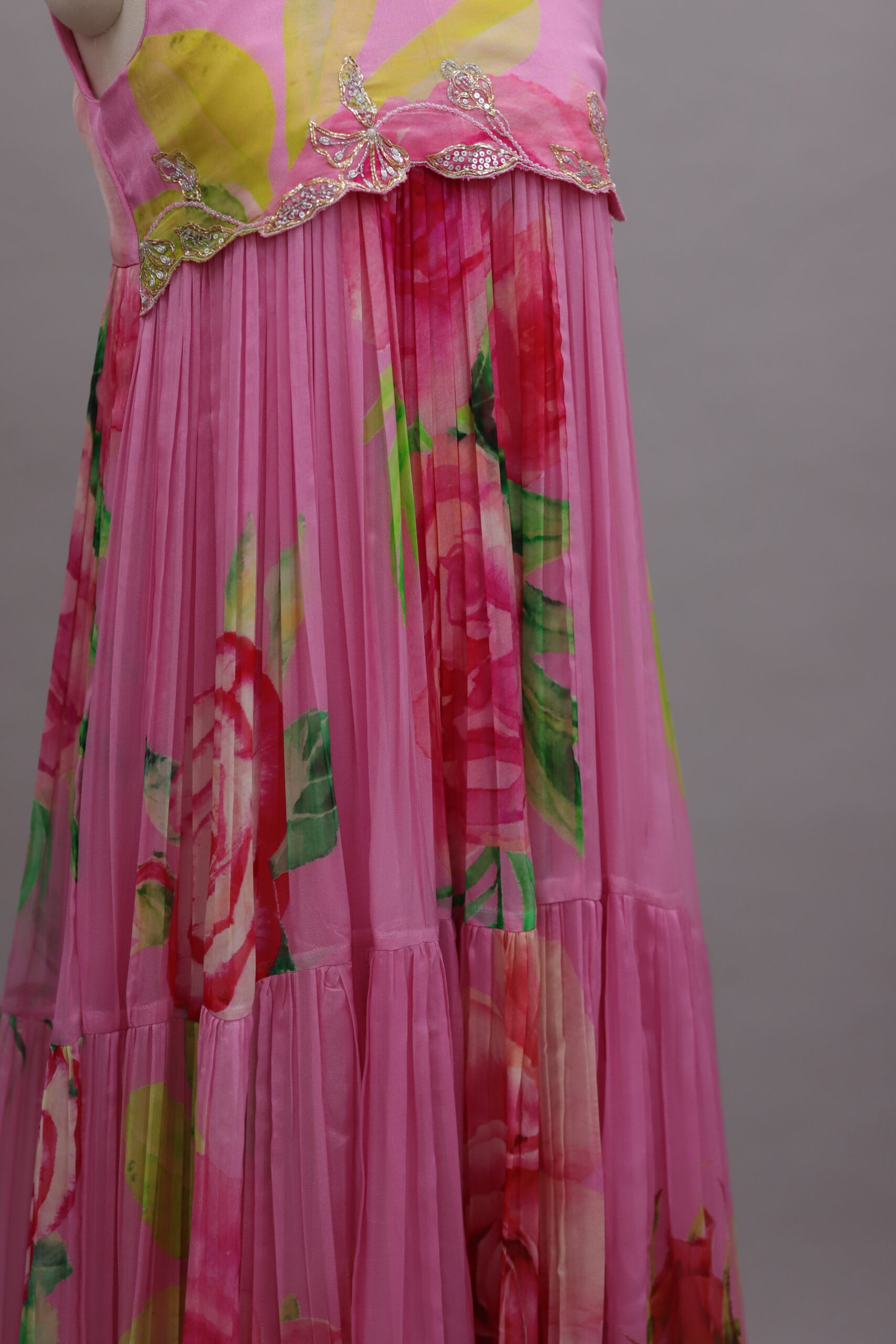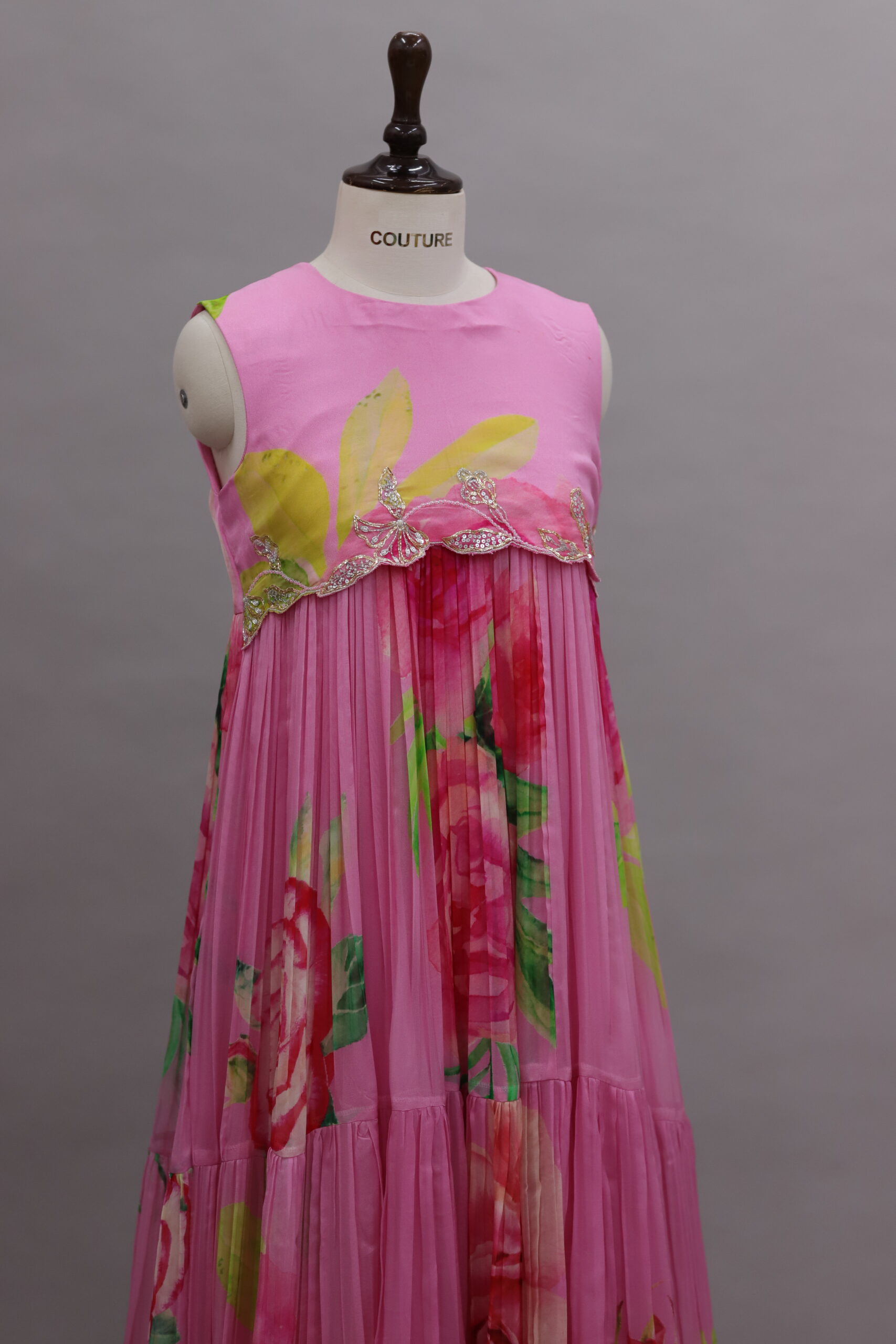 Beautifully crafted in premium organza fabric, this dress features a vibrant floral print that adds a fresh, feminine touch. The yoke is highlighted with elegant floral motifs, giving it a refined and stylish appeal. The pleated flare adds graceful movement, making it a stunning choice for night parties, special evenings, and festive celebrations. Lightweight, flowy, and effortlessly charming—perfect for making a statement with elegance.