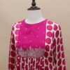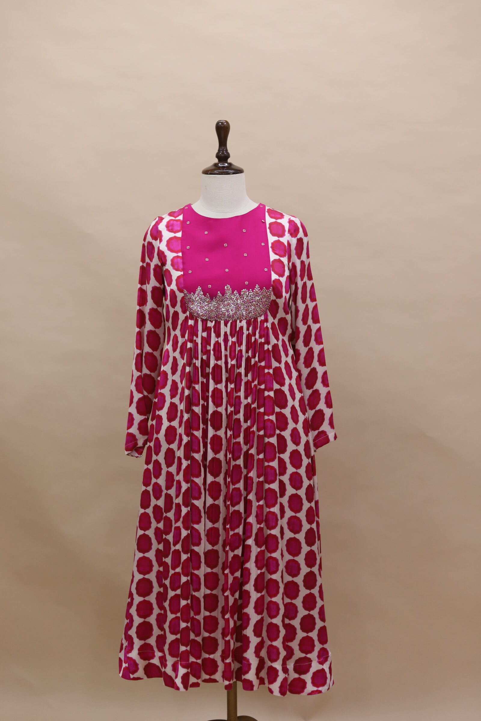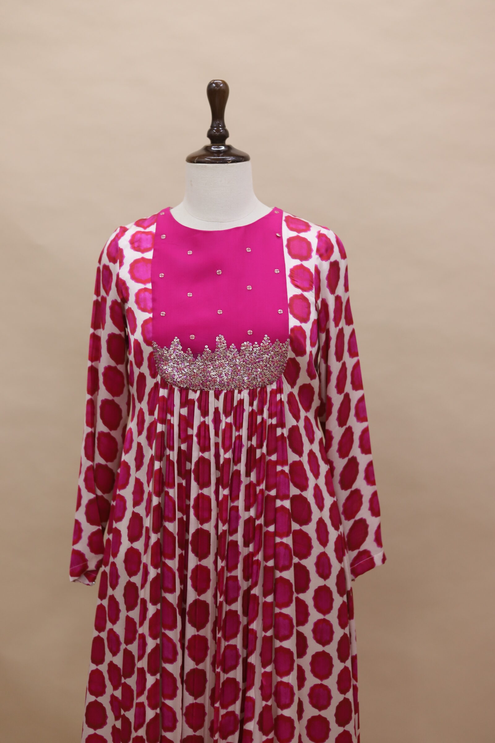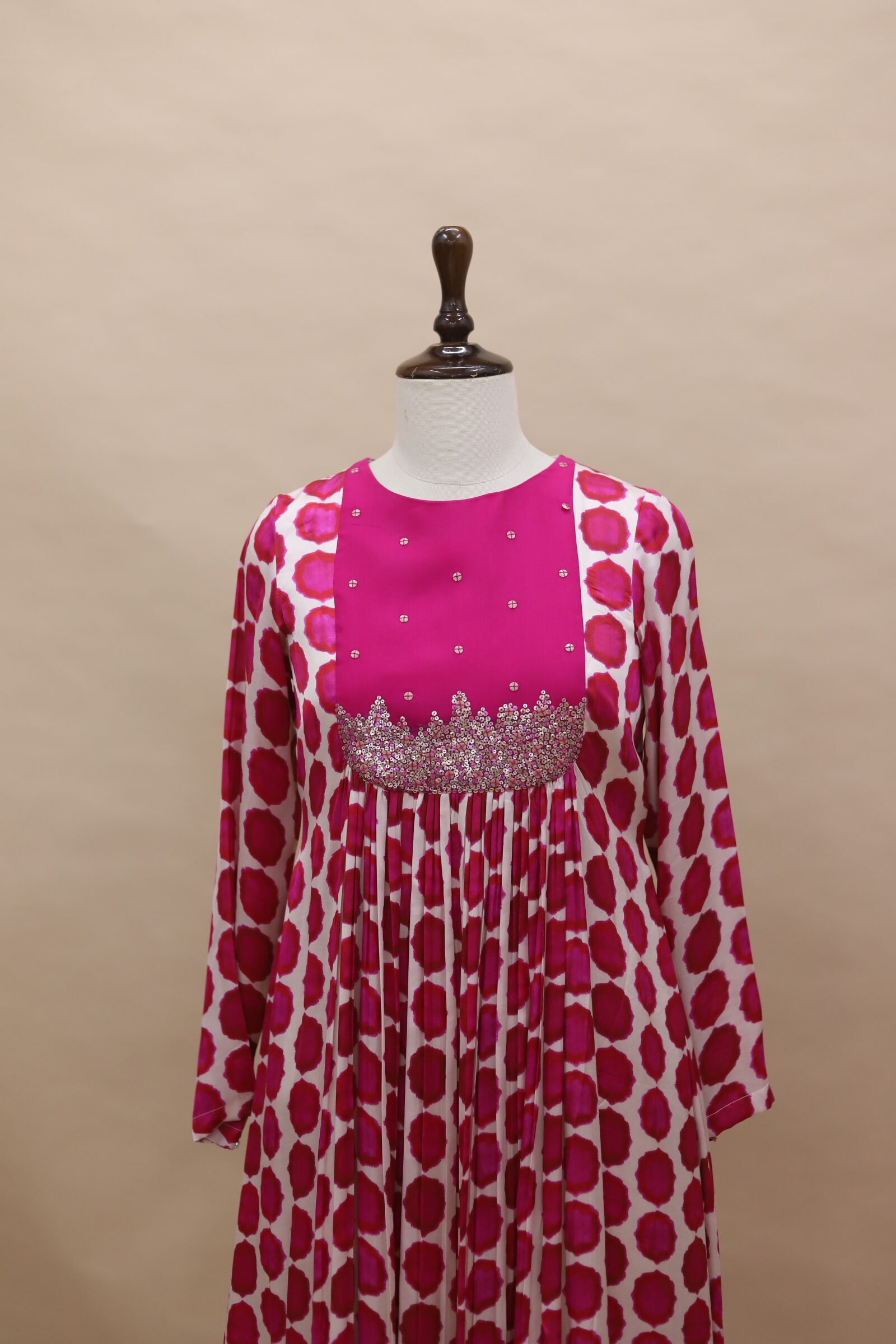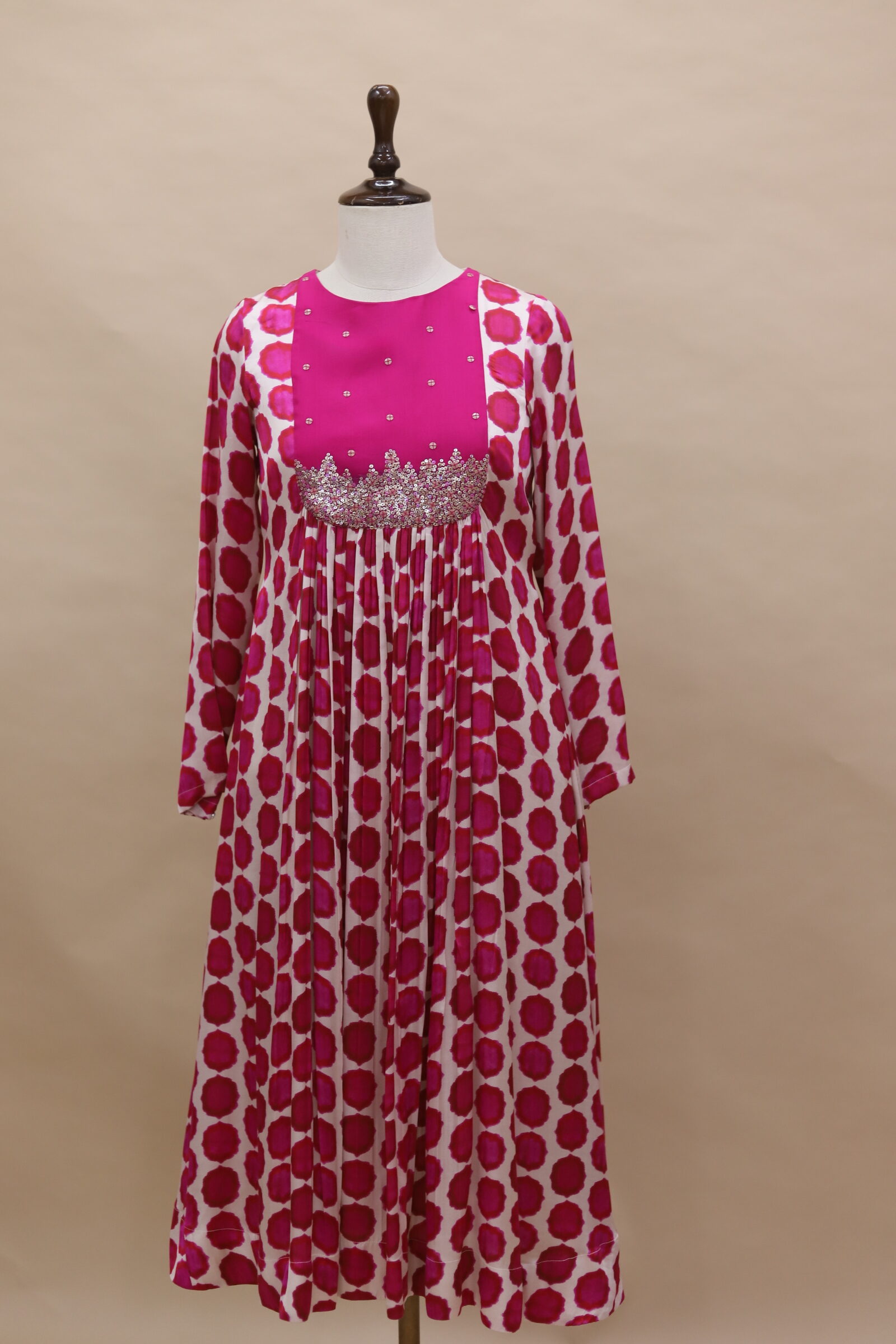 A graceful dress crafted in crepe silk dot-print fabric, featuring a beautifully designed yoke adorned with intricate hand-done sequin work. The flowing silhouette with soft pleats adds effortless movement, making it perfect for festive and celebratory occasions. (1 piece)