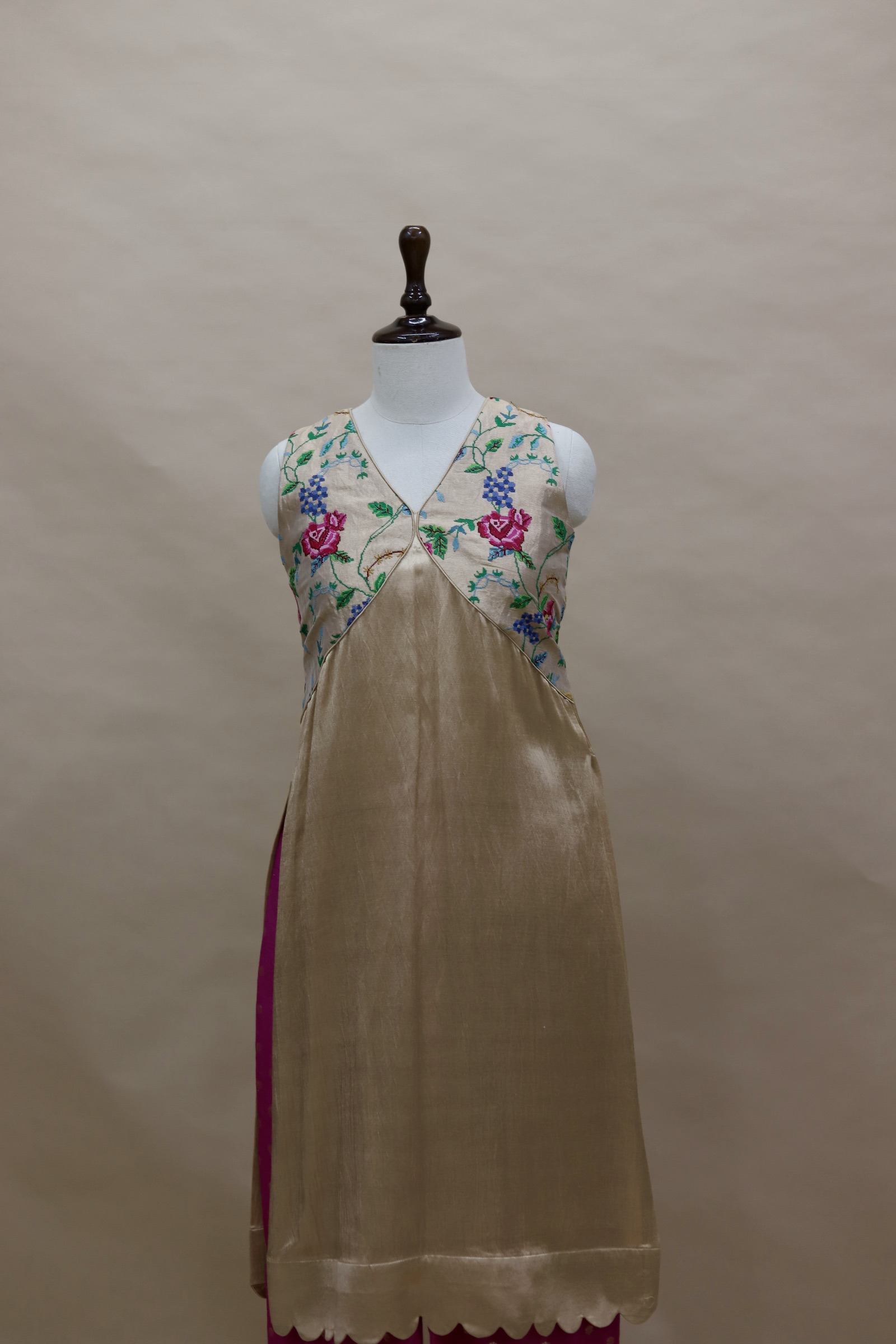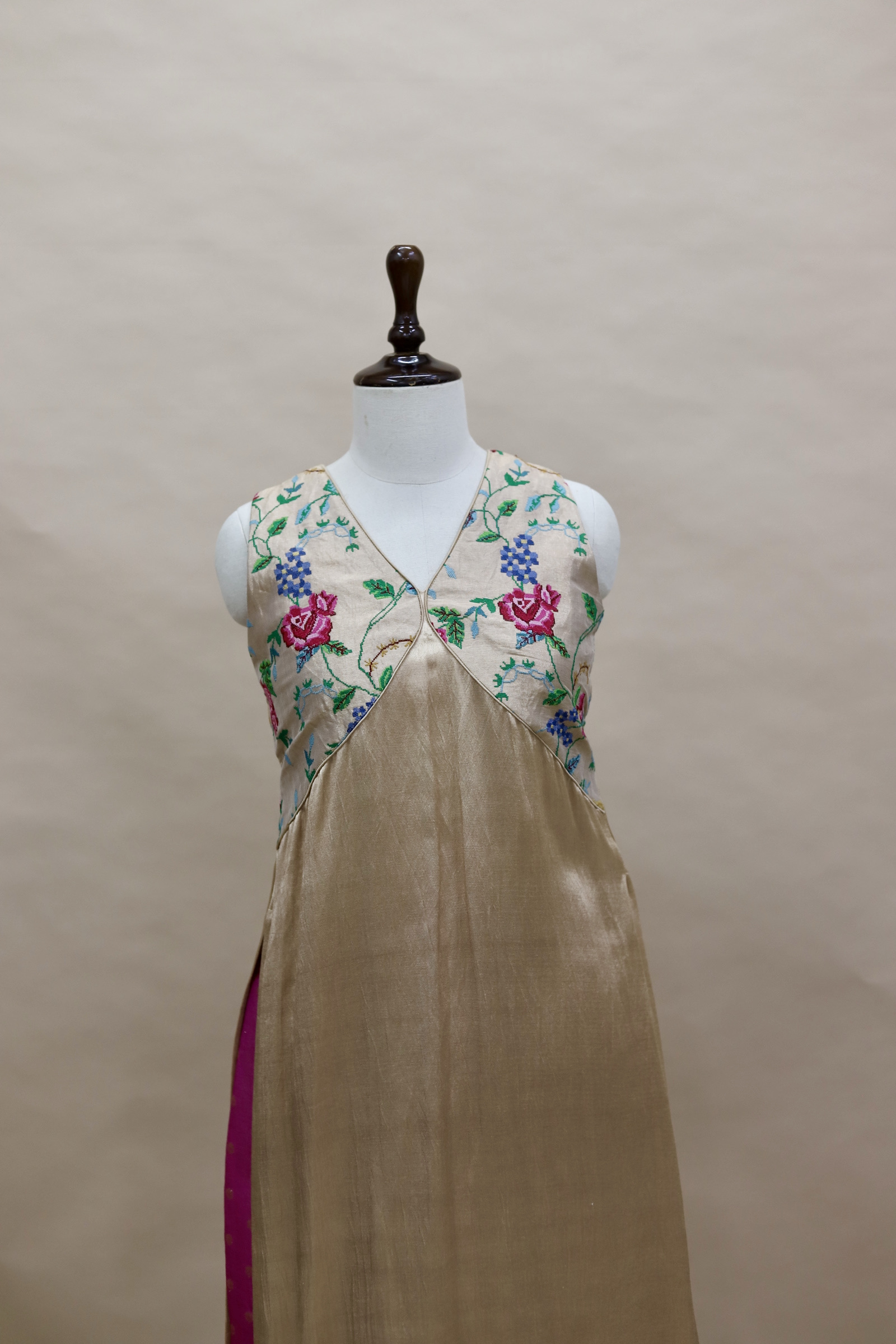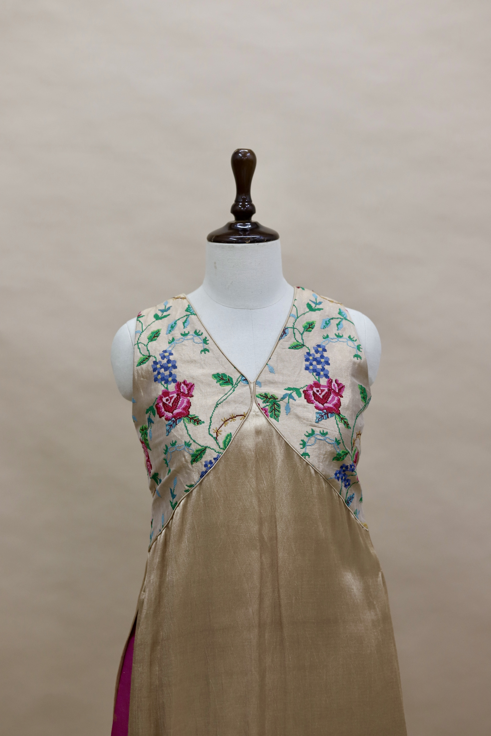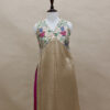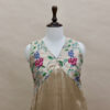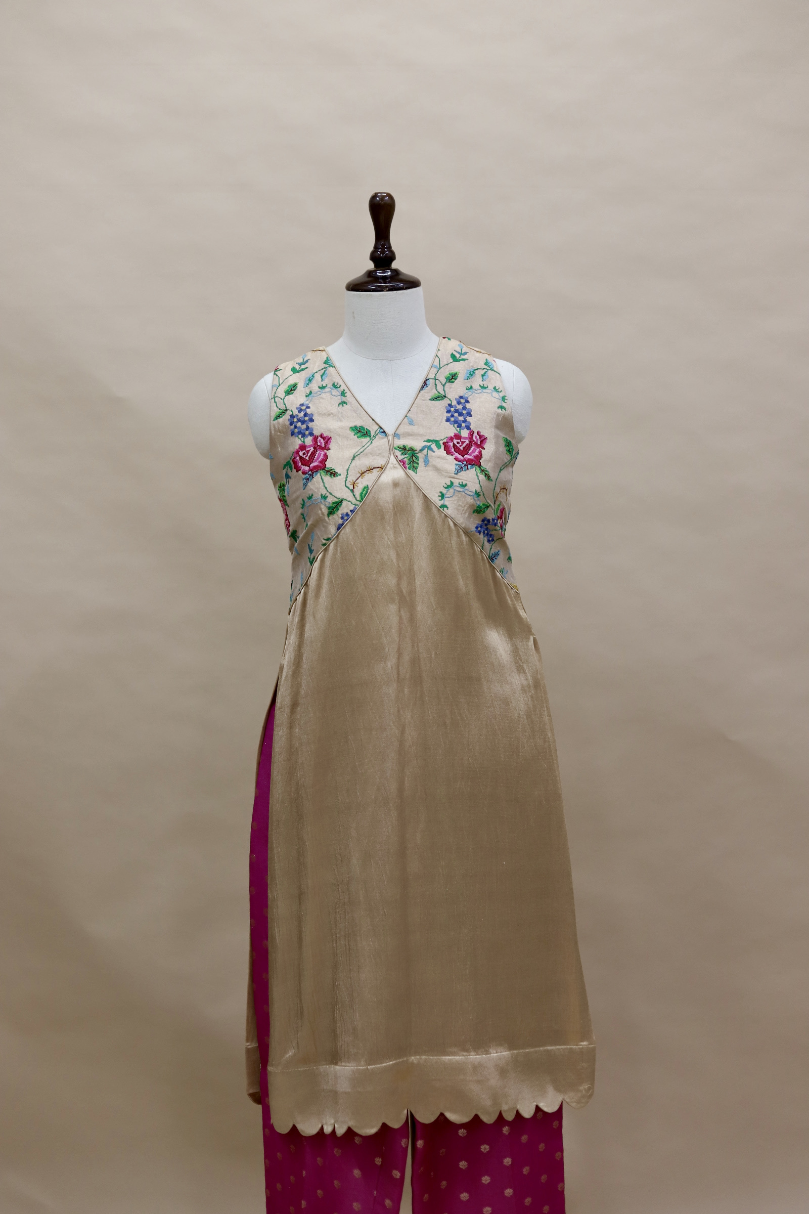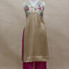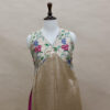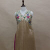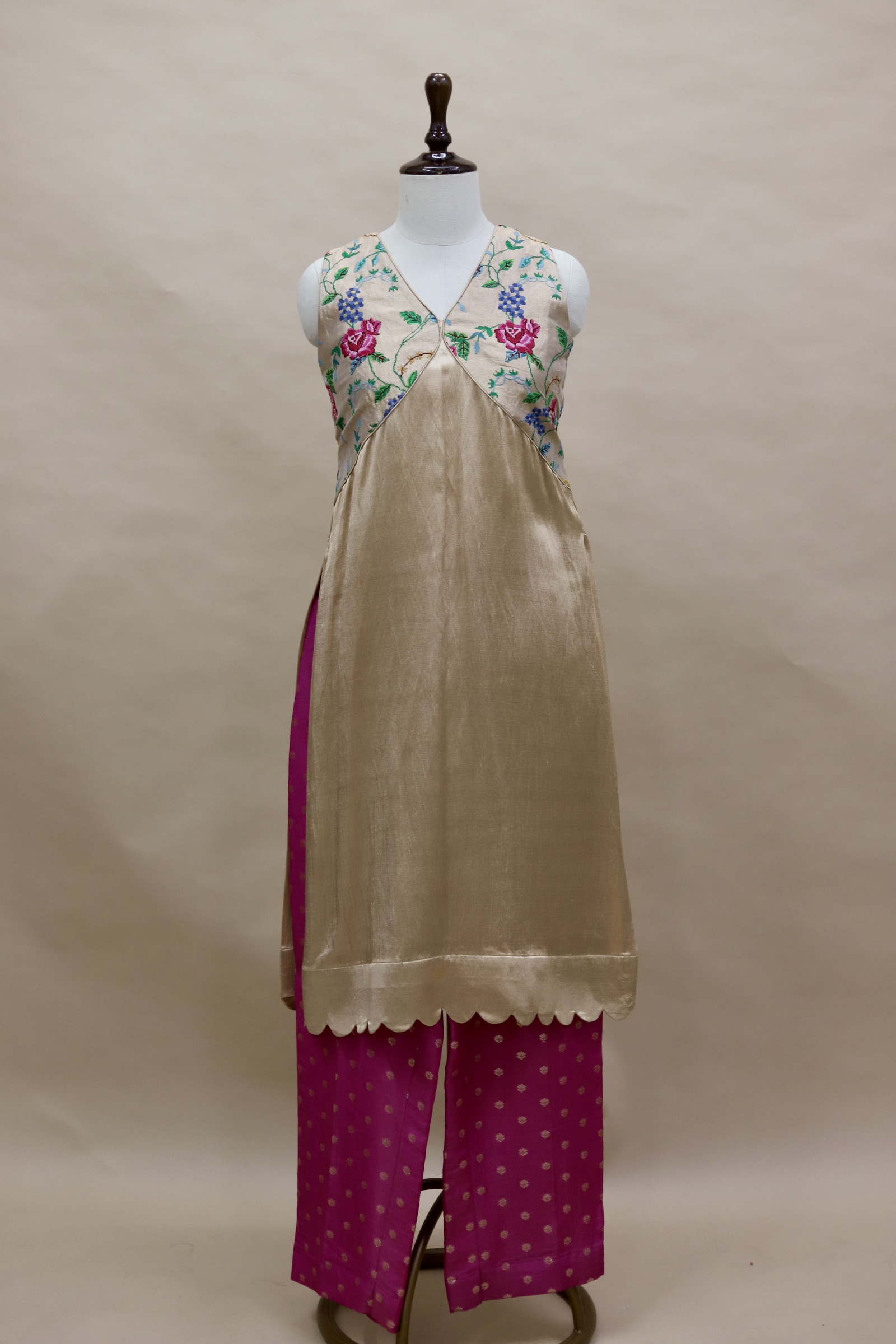 A refined ensemble featuring a top crafted in rich Mashru satin, highlighted with a delicate tissue yoke adorned with intricate petit point handwork. Paired with matching tissue pants detailed with subtle butti motifs, this outfit blends traditional craftsmanship with contemporary elegance.
