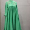 This dress is a stunning shade of emerald green, exuding elegance and grace. The upper bodice is adorned with delicate floral embroidery in gold and pastel green, adding a touch of intricate craftsmanship. The high-neck design and full sleeves.complemented by subtle lace detailing.