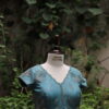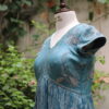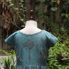 This teal blue gown is beautifully adorned with silver floral patterns, giving it a delicate and refined look. The bodice features intricate embroidery with leaf motifs, enhanced by fine beadwork along the neckline and sleeves. The short cap sleeves add a touch of elegance.