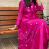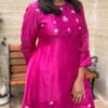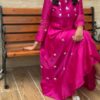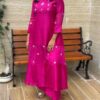 A stunning A-line silhouette tailored from lustrous fabric, blending tradition with contemporary elegance. The dress features a close neckline adorned with delicate handwork, showcasing multi-designed butties that lend a refined sparkle. The midsection and sleeves are accentuated with sheer organza panels, intricately woven with subtle butti motifs, adding depth and grace to the look. Paired with coordinated pants, this ensemble radiates poise and sophistication — perfect for festive gatherings, evening celebrations, or elegant soirées.