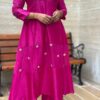 A stunning A-line silhouette tailored from lustrous fabric, blending tradition with contemporary elegance. The dress features a close neckline adorned with delicate handwork, showcasing multi-designed butties that lend a refined sparkle. The midsection and sleeves are accentuated with sheer organza panels, intricately woven with subtle butti motifs, adding depth and grace to the look. Paired with coordinated pants, this ensemble radiates poise and sophistication — perfect for festive gatherings, evening celebrations, or elegant soirées.