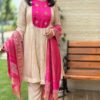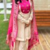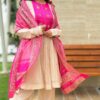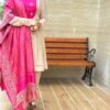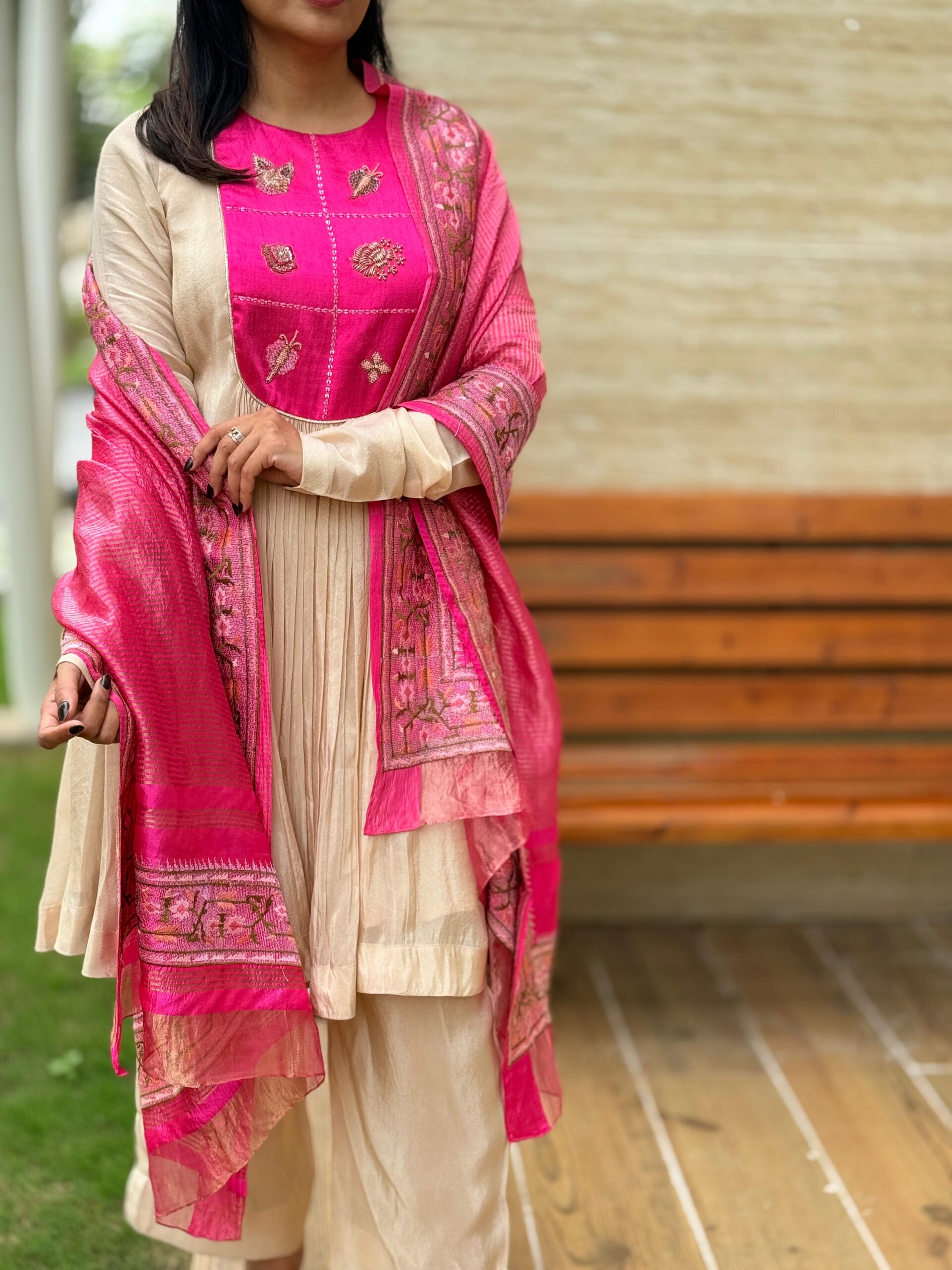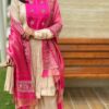 A stunning pure tissue short top paired with matching pants, crafted to give a subtle festive shimmer. The yoke is beautifully adorned with six intricate motifs, adding a touch of traditional artistry to the contemporary silhouette. The ensemble is completed with a graceful tissue-strip dupatta, featuring delicate shimmering lines that enhance the overall elegance. Perfect for poojas, small celebrations, and evening gatherings.