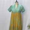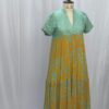 This dress is a stylish fusion outfit featuring a light bluenish tissue fabric on the yoke and sleeves, adorned with delicate golden motifs for a festive touch.A mustard yellow base with an abstract leaf-like print in the same blue color, made from georgette fabric, making it lightweight and airy.