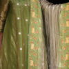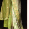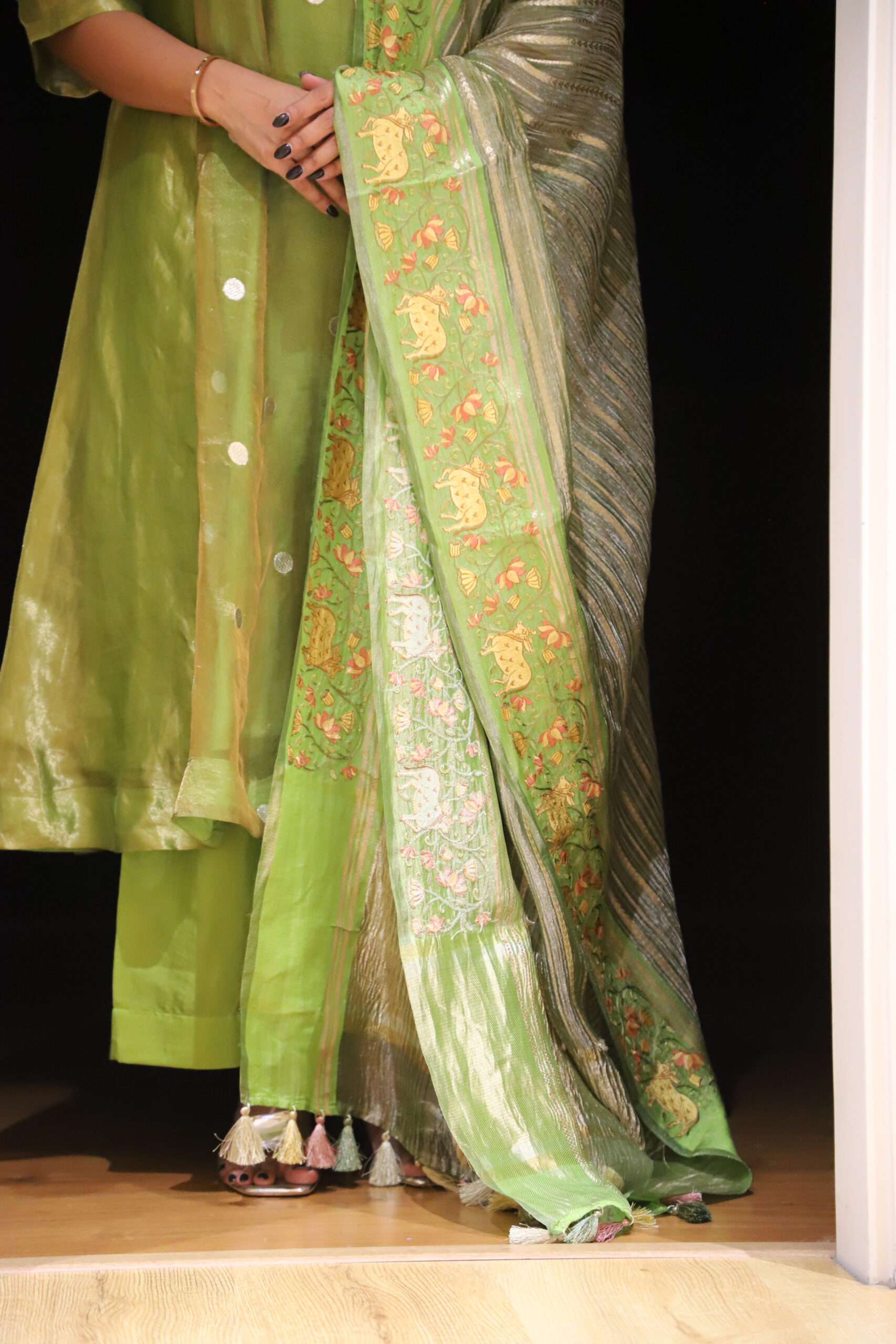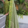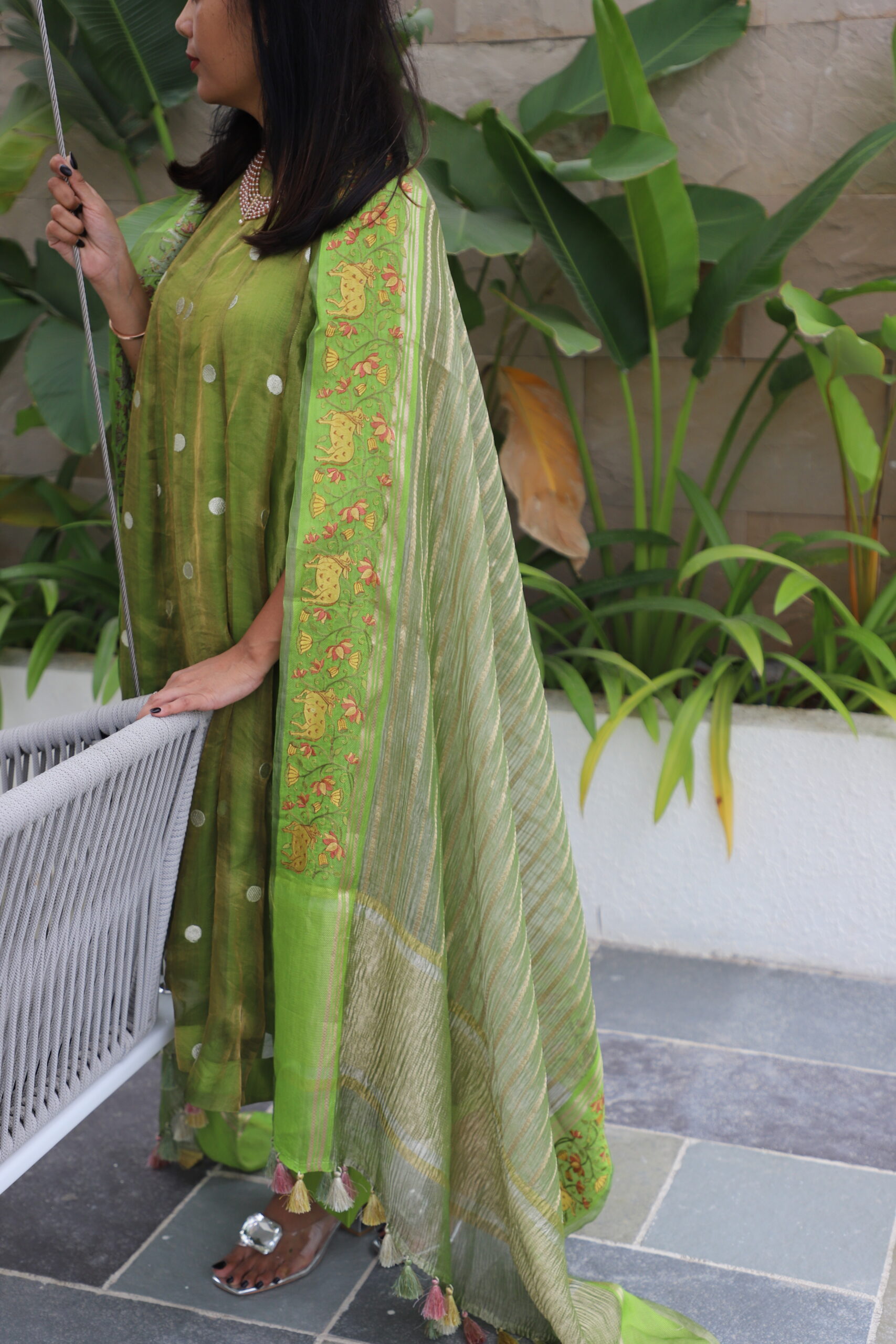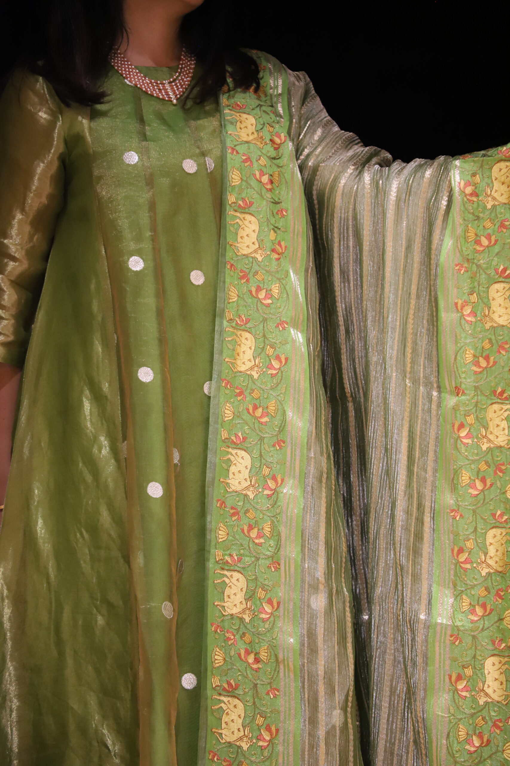 Elegant A-line kurti patterned with soft kalis, crafted in pure tissue fabric adorned with subtle silver polka dots that lend a delicate shimmer. It is paired with a rich Uppada silk bottom and a crushed tissue dupatta featuring exquisite Pichwai work on both side borders. This ensemble beautifully blends traditional artistry with modern elegance, making it perfect for festive occasions, poojas, and evening gatherings.