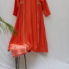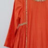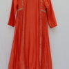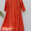This tawny orange dress features a flared silhouette with elegant golden embellishments along the neckline, sleeves, and vertical panel lines.Adding a rich and festive appeal. The three-quarter sleeves and flowy design give it a graceful, traditional look. Paired with matching orange pant featuring a white geometric printed.