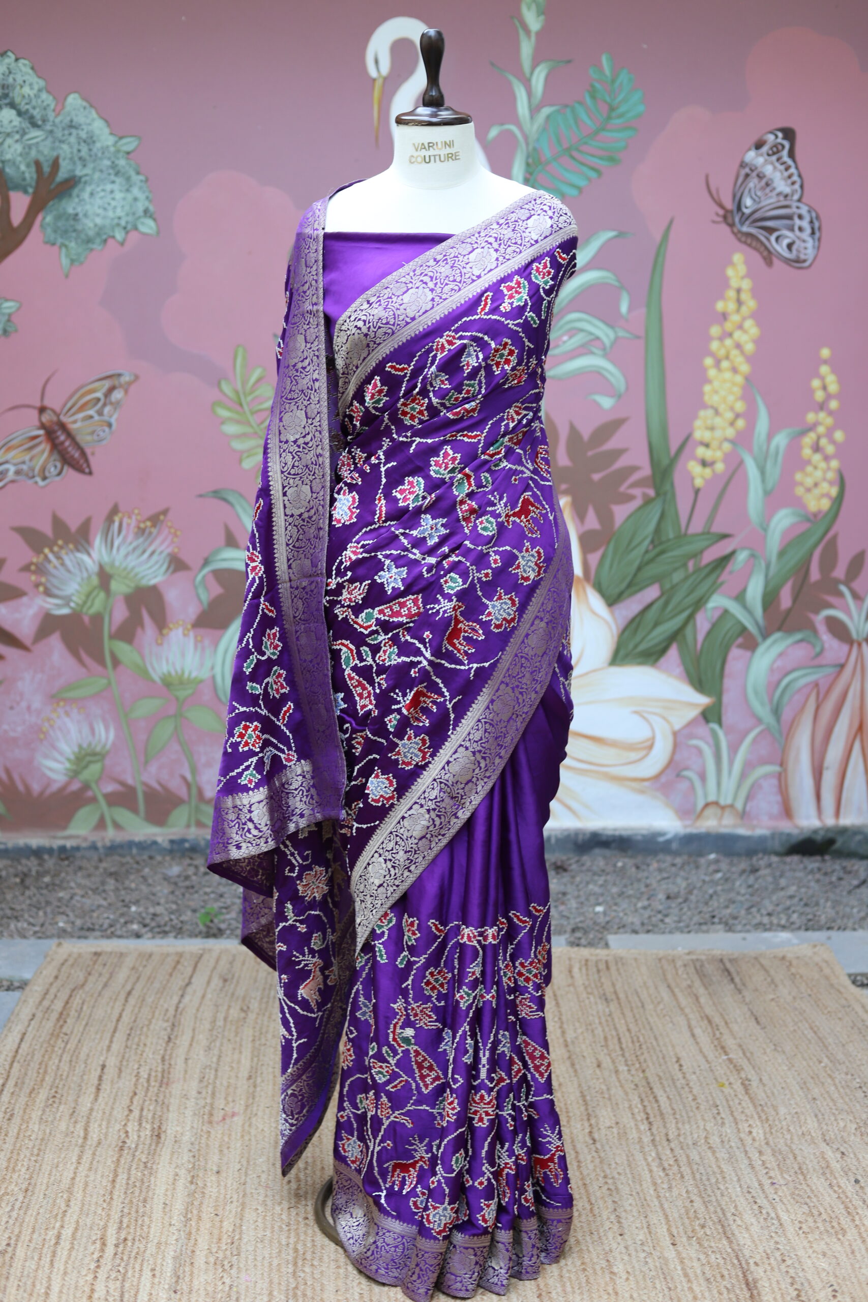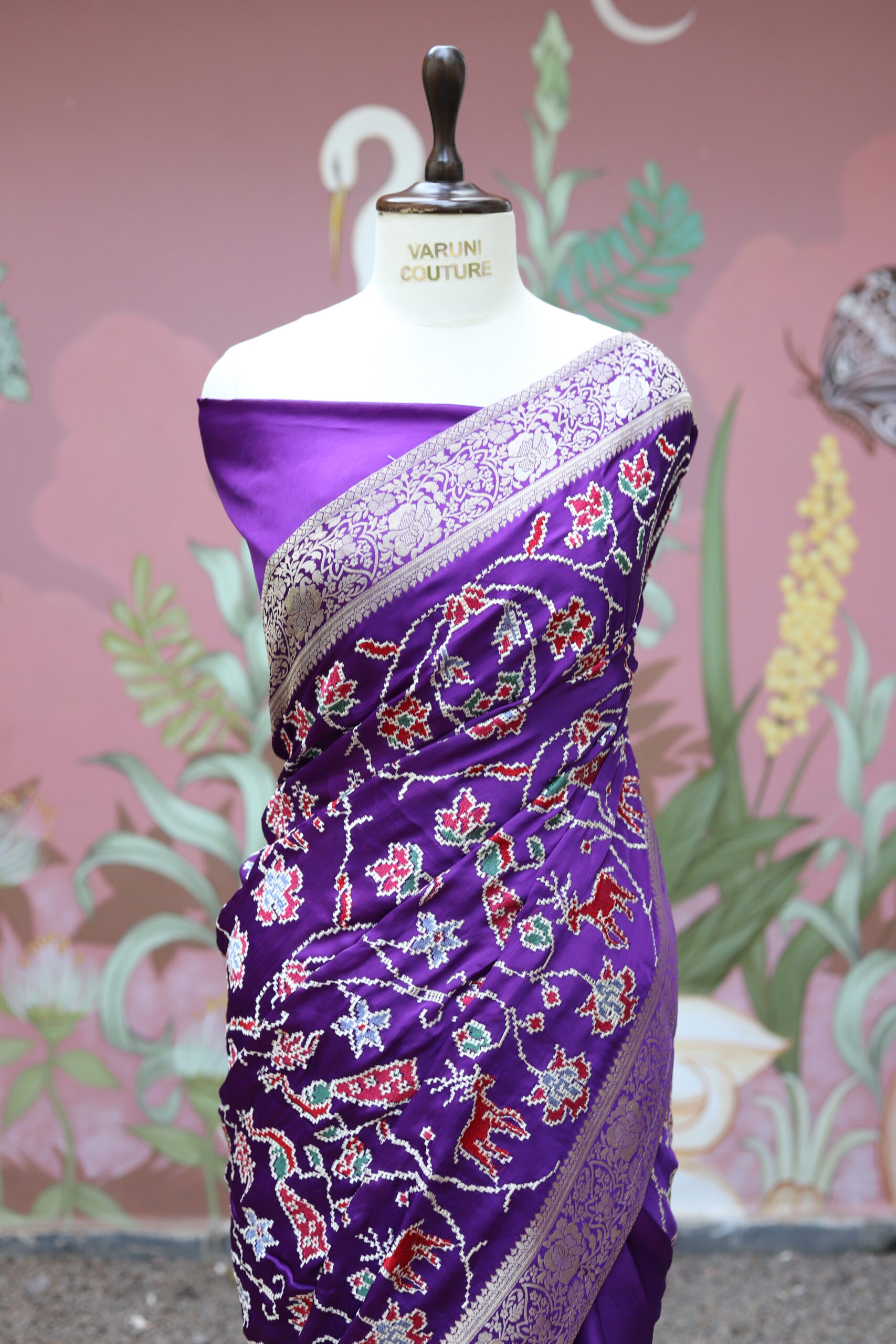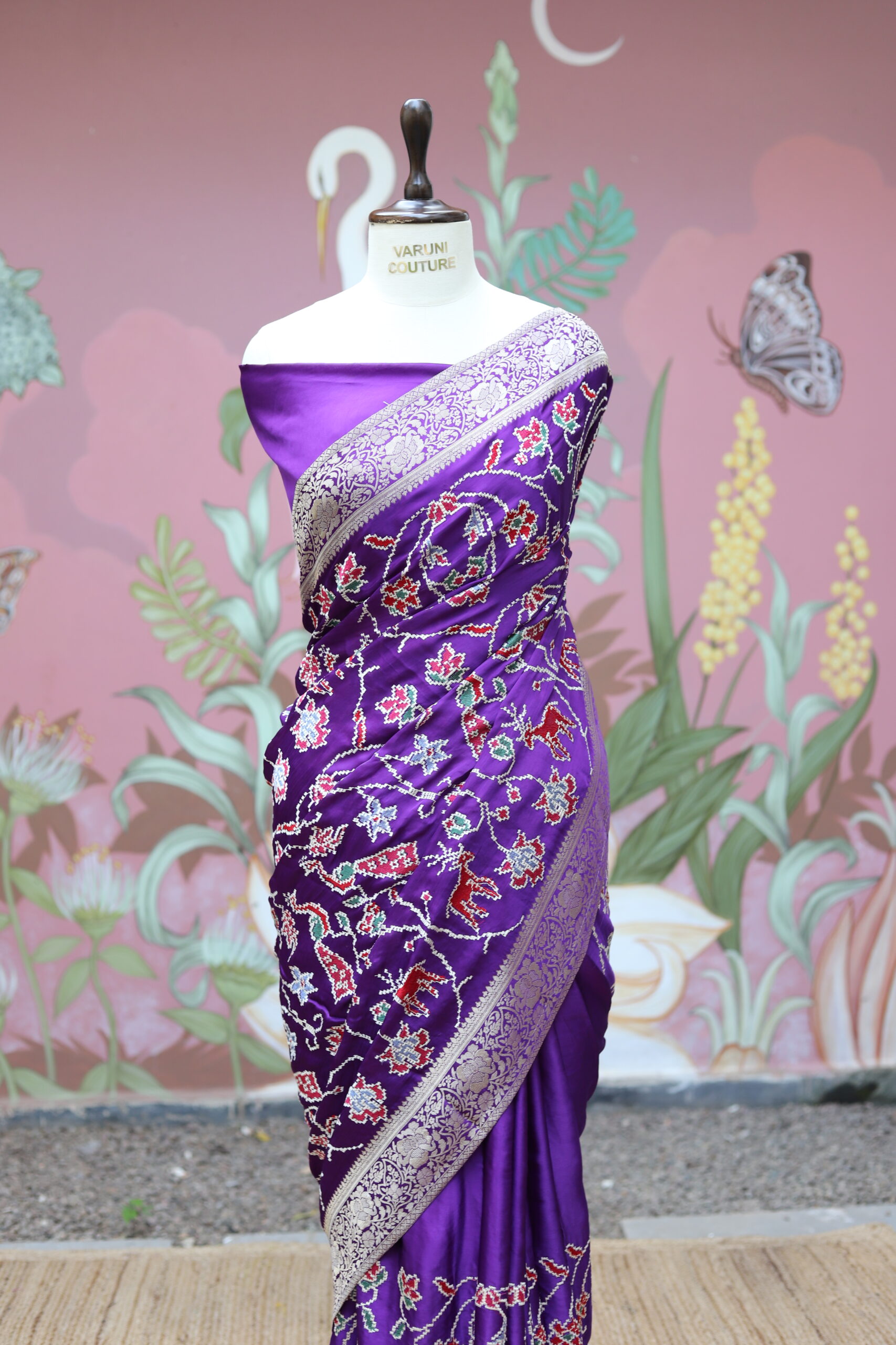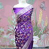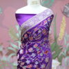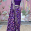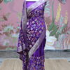 Exquisite pure saree adorned with intricate Aari embroidery across the body, featuring delicate floral and vine motifs. The design is beautifully complemented by a rich Banaras woven border that adds a regal touch. Paired with a plain blouse enhanced with a matching Banaras border for the sleeves, this saree is a perfect blend of traditional craftsmanship and timeless elegance.
