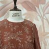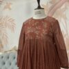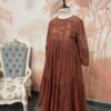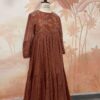 The “Van Dyke” dress is a deep rust-brown shade, exuding earthy elegance. Its bodice is beautifully adorned with delicate floral embroidery, adding a subtle contrast and intricate detailing. Crafted from lightweight Kota cotton, the fabric drapes gracefully in a tiered, flowy silhouette, ensuring both comfort and style. Sheer, full-length sleeves with gentle ruffle accents complete the look