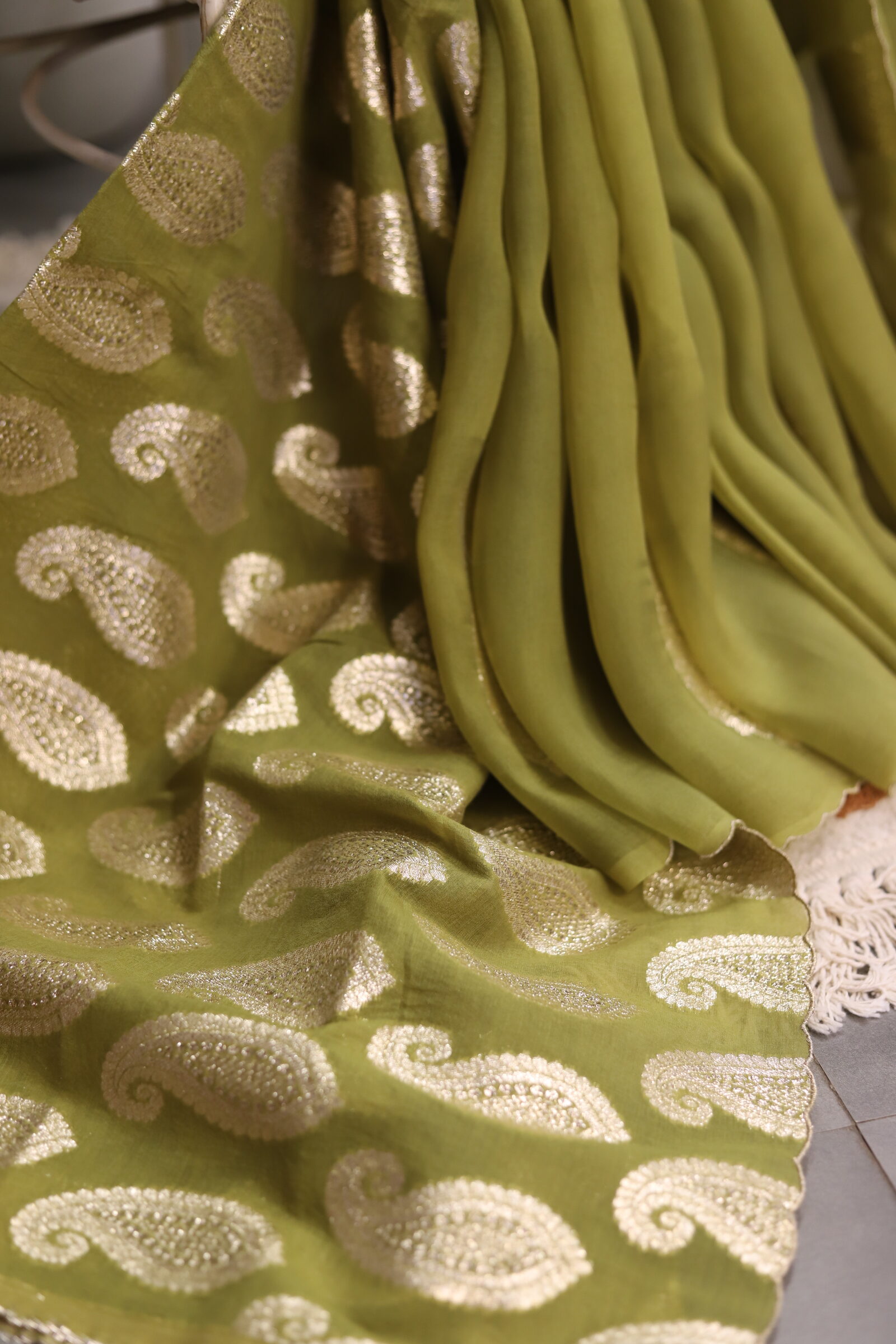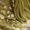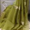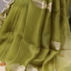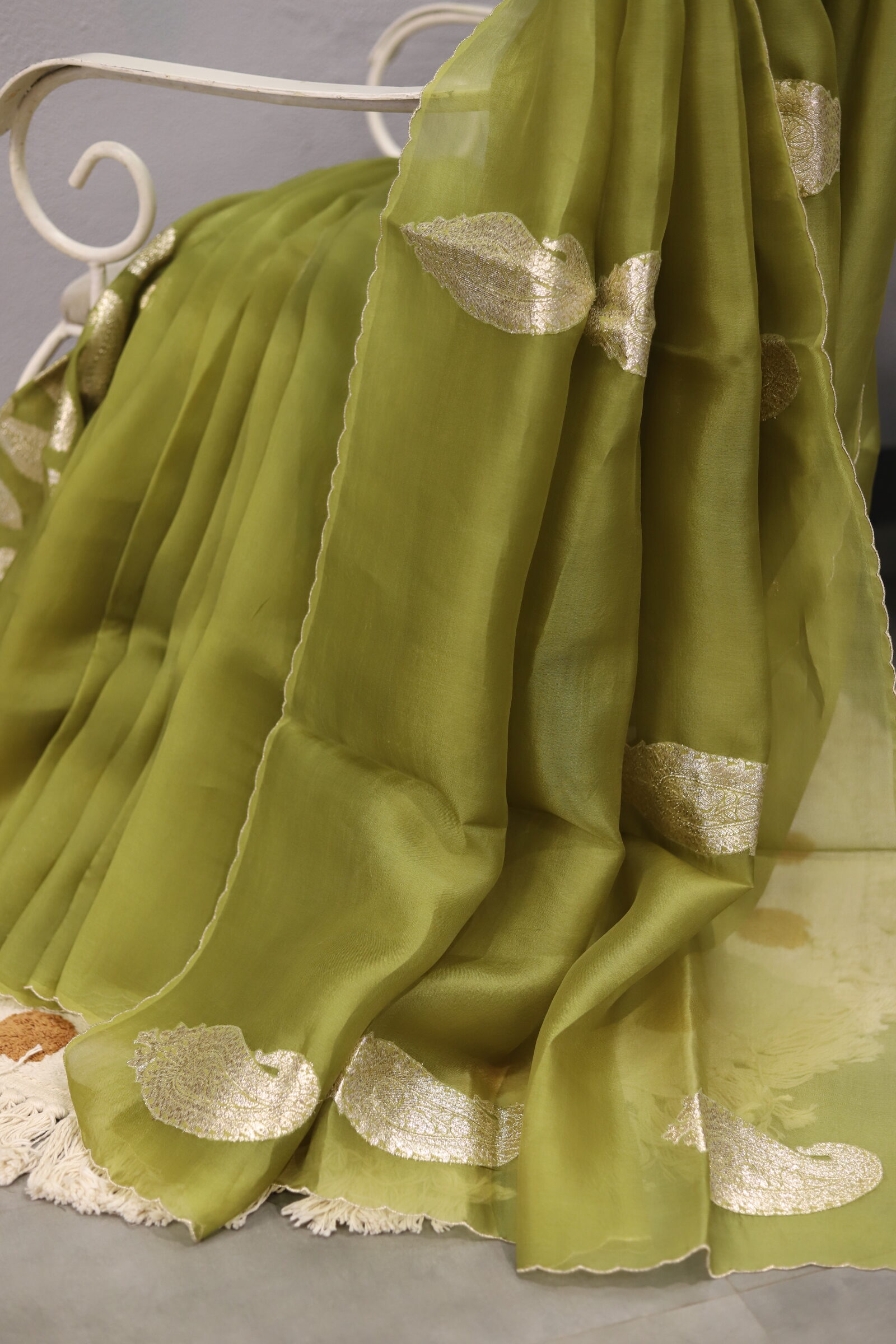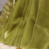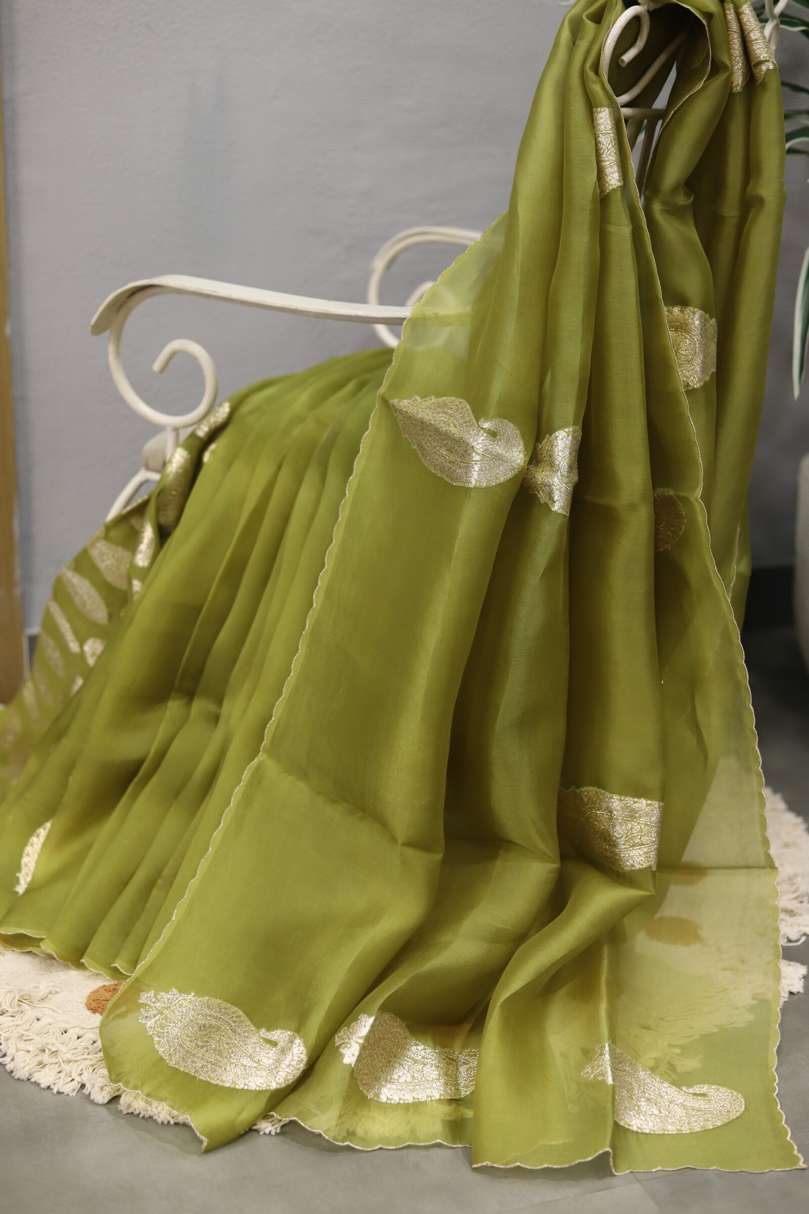 A graceful organza saree highlighted with delicate gota patti buttis scattered all over, finished with refined scalloped borders on all four sides. Comes with a soft muslin blouse beautifully detailed with matching gota patti buttis, perfect for a subtle yet festive look.