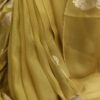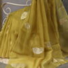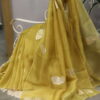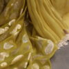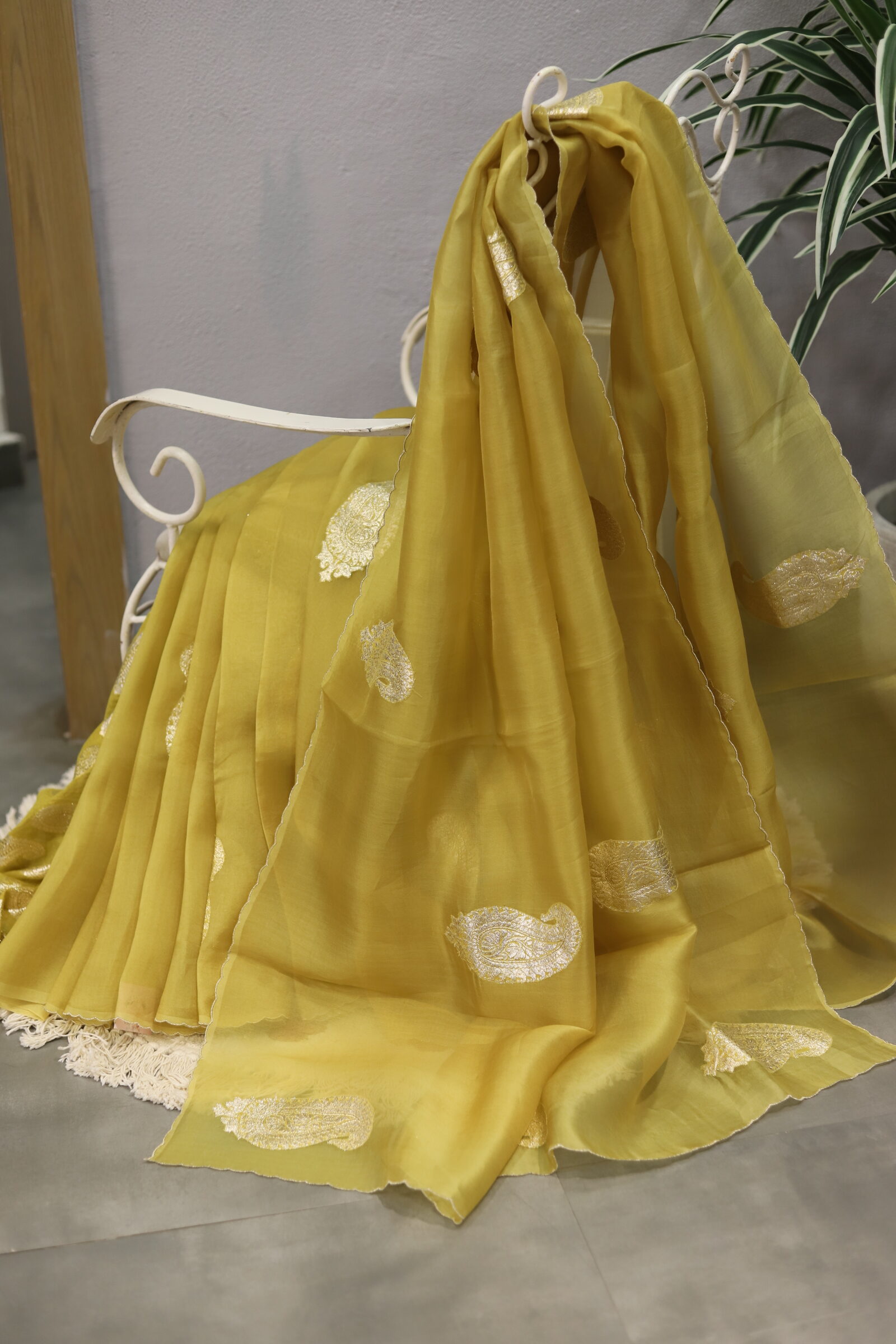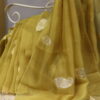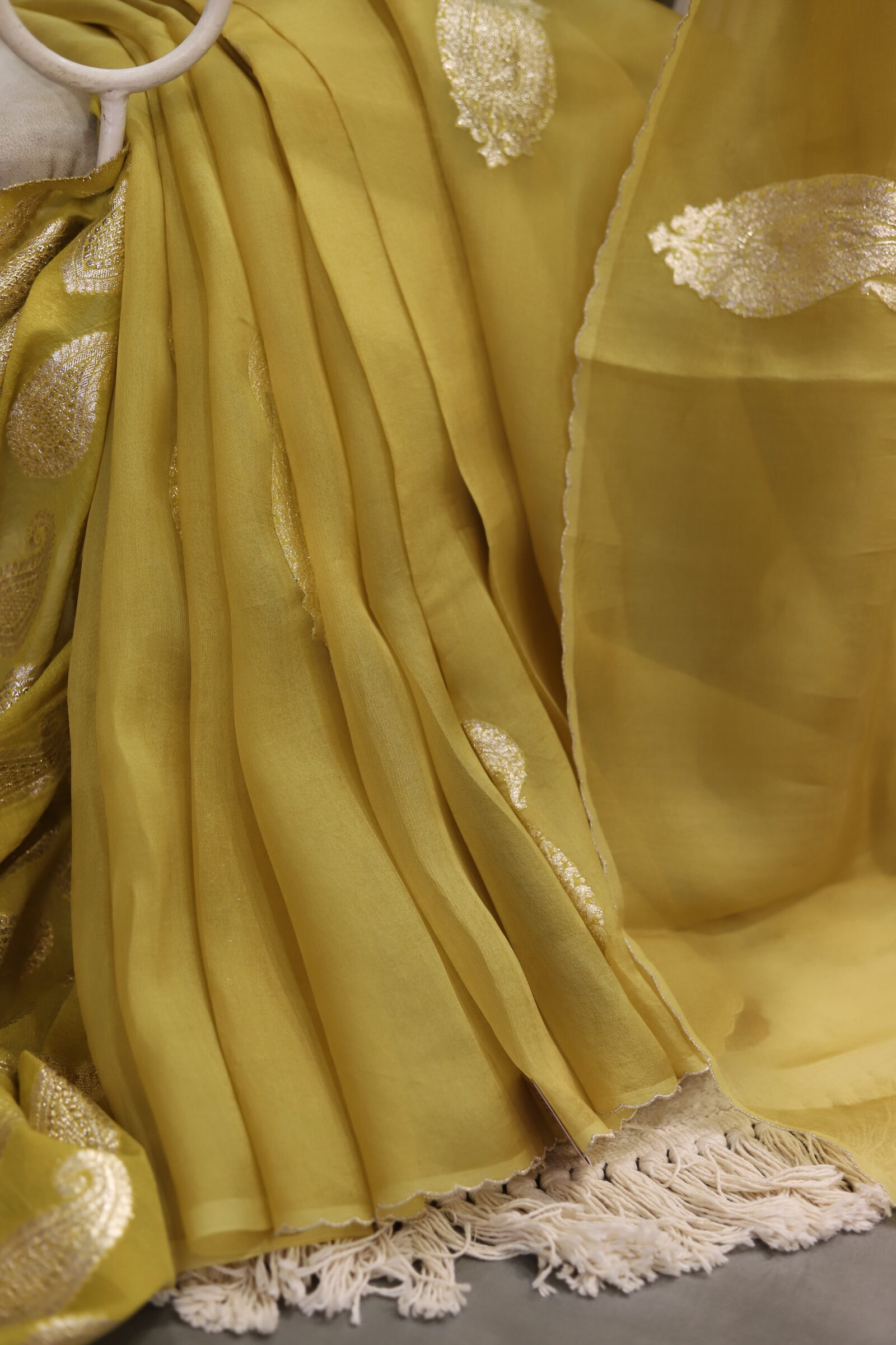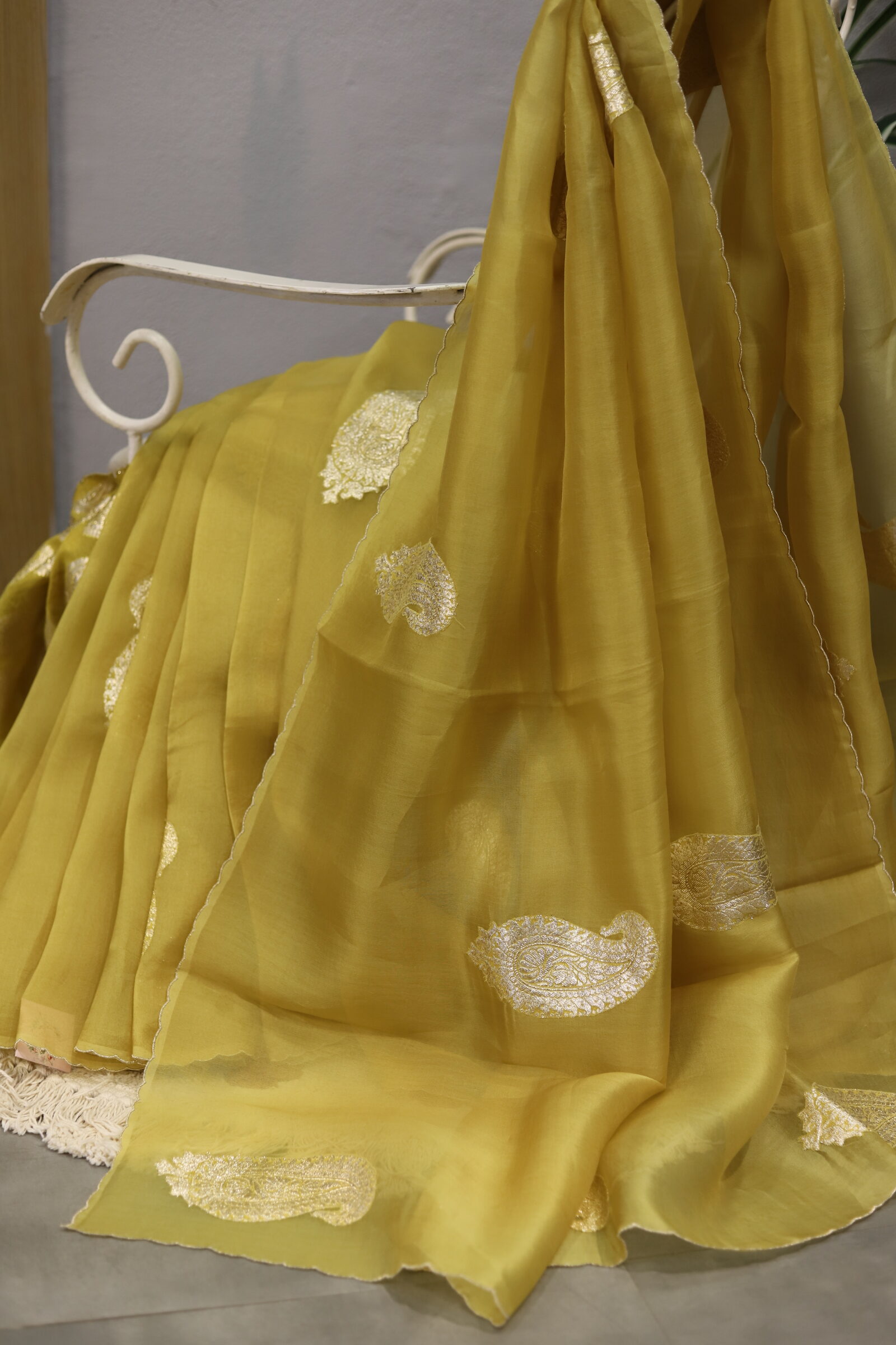 A graceful organza saree highlighted with delicate gota patti buttis scattered all over, finished with refined scalloped borders on all four sides. Comes with a soft muslin blouse beautifully detailed with matching gota patti buttis, perfect for a subtle yet festive look.