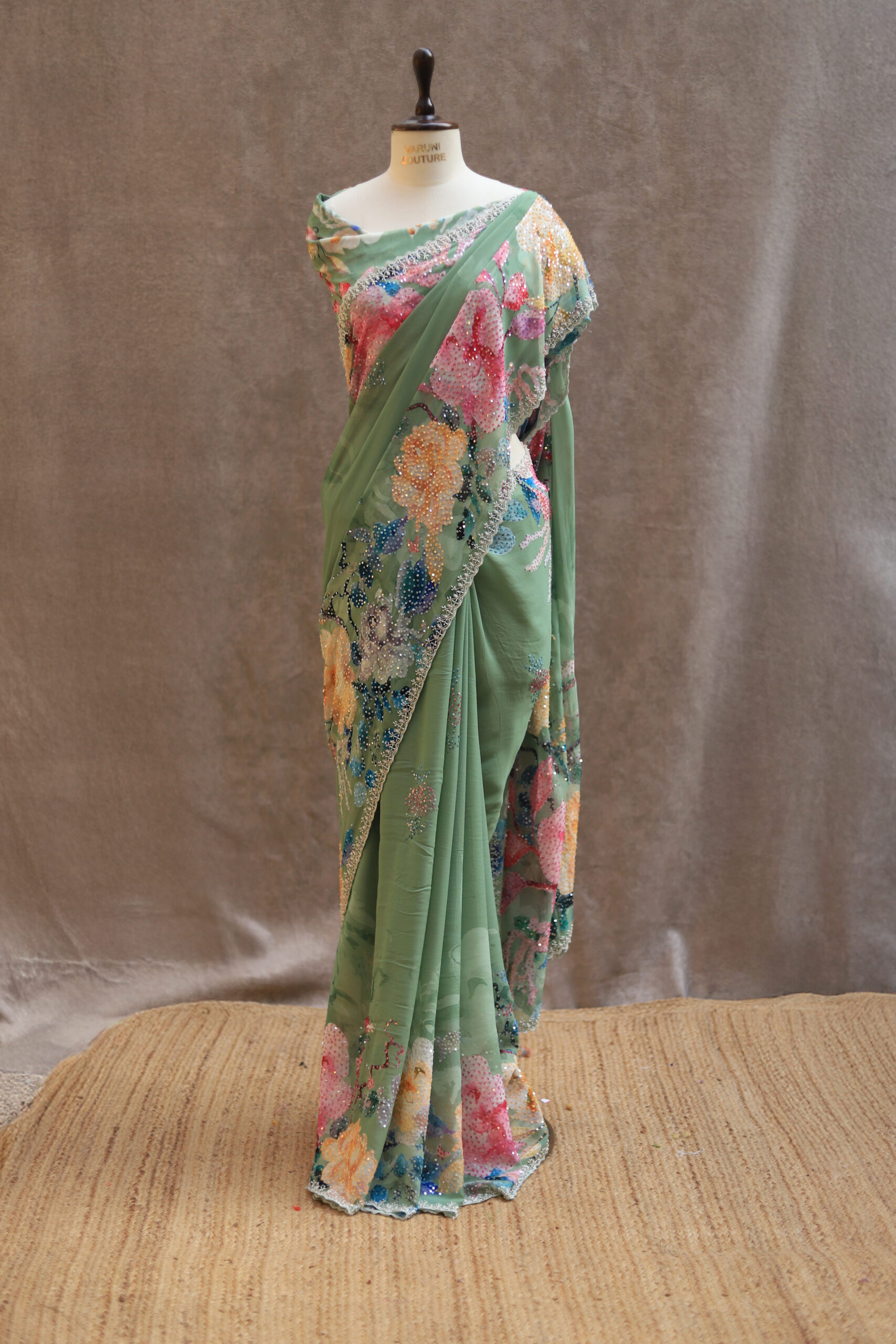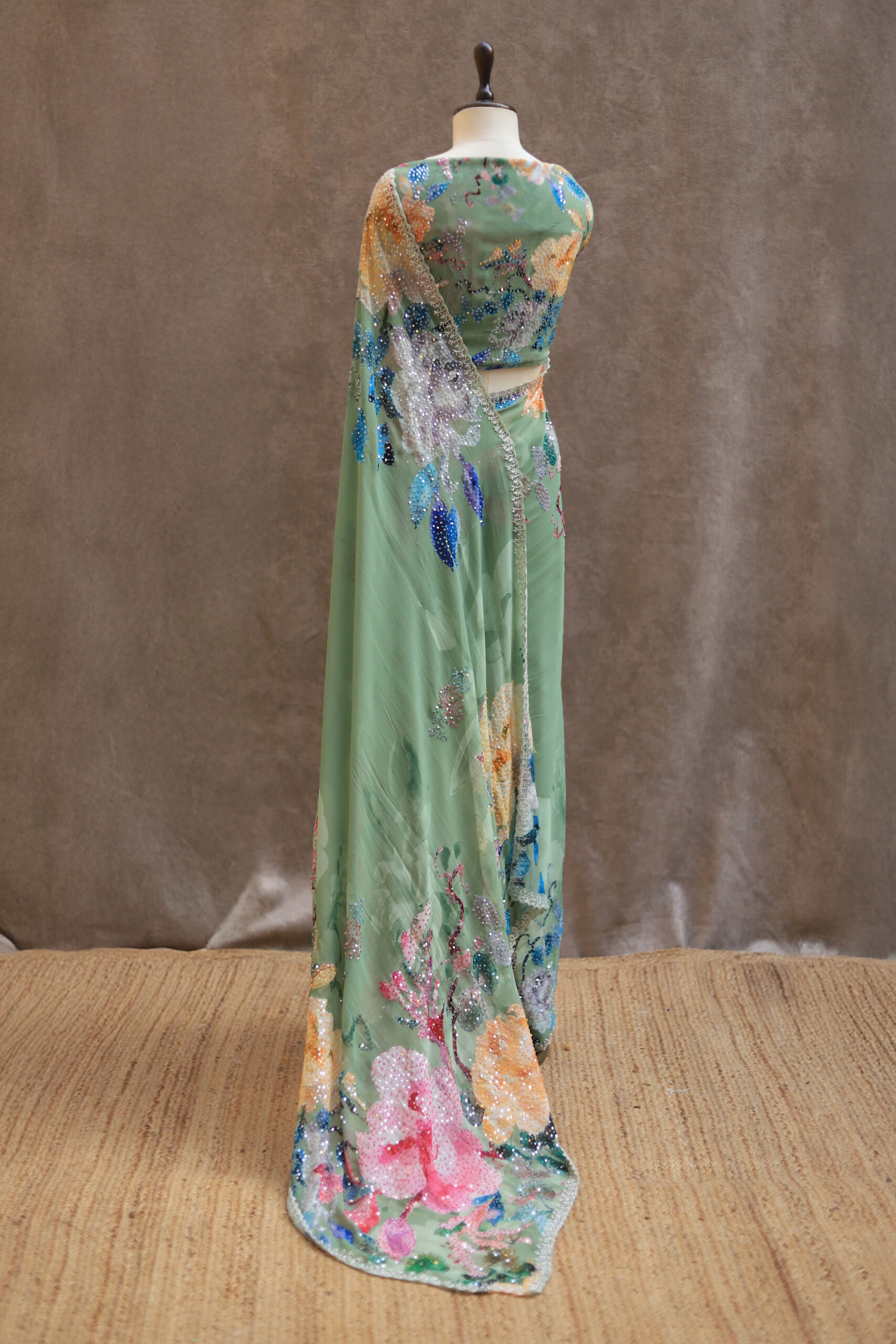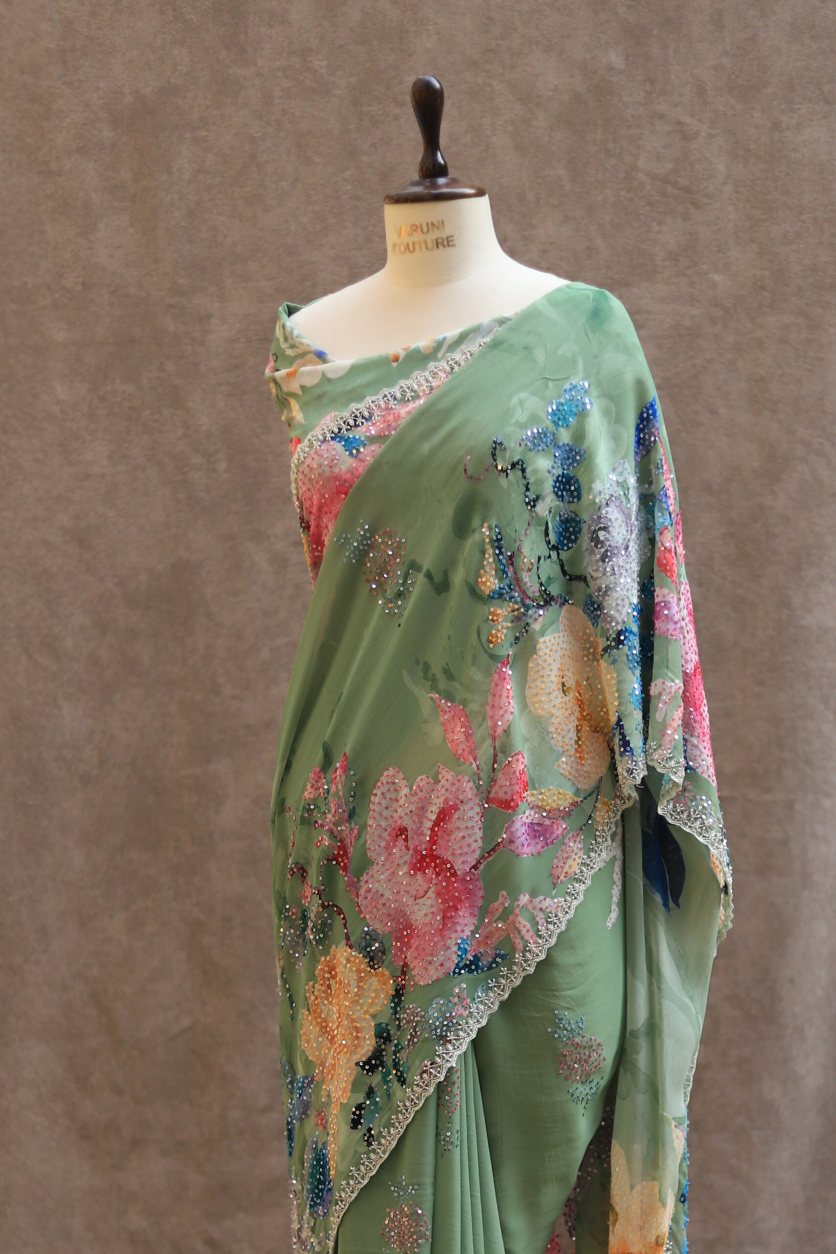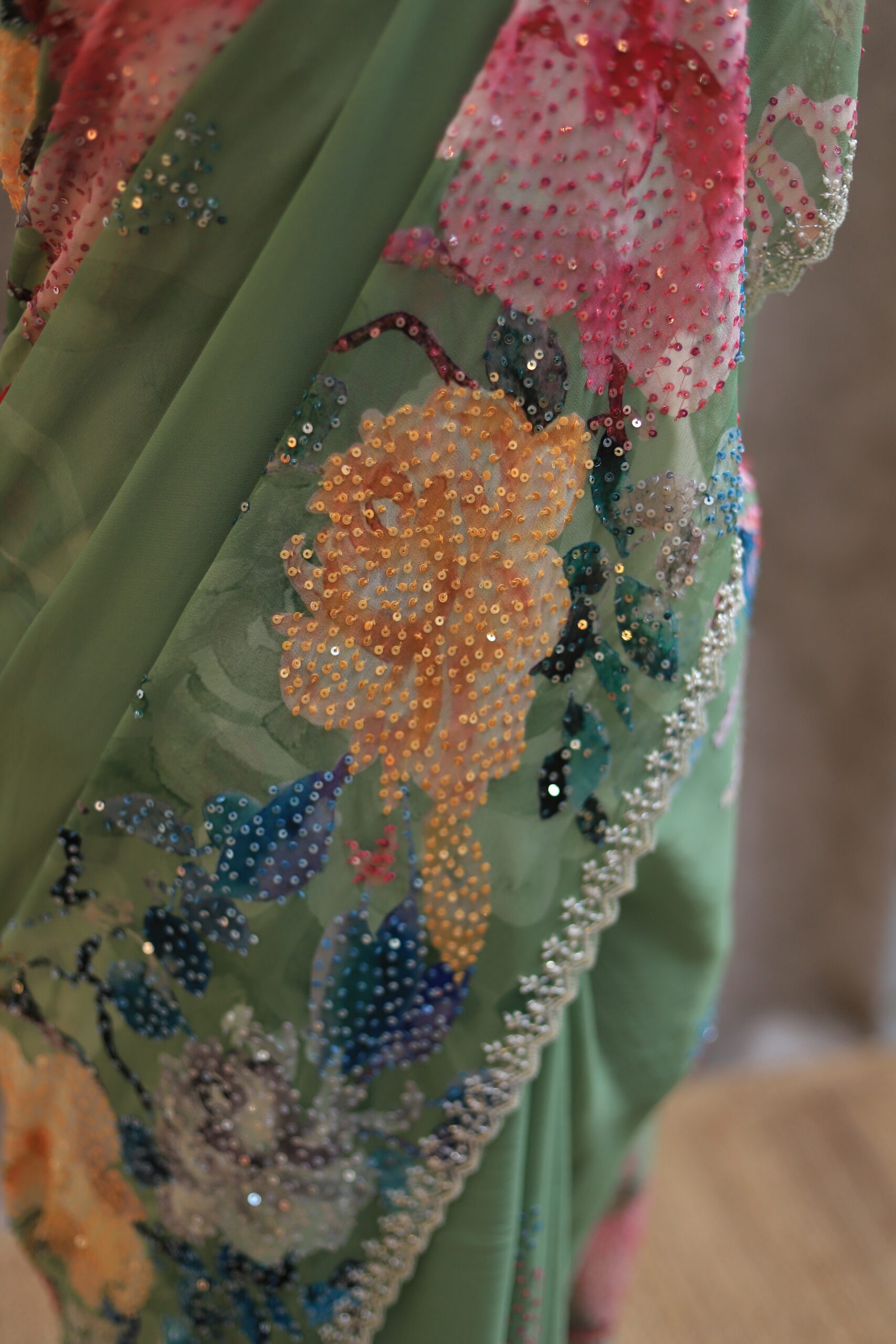 A pure Georgette saree adorned with a graceful all-over floral print, enhanced further with highlighted floral motifs embellished with delicate sequin work. The edges are finished with a beautifully hand-worked scallop detailing, adding a refined charm to the drape. The blouse piece is crafted with intricate sequin work and complemented by scallop-finished sleeves, making it a perfect blend of sophistication and subtle shimmer.