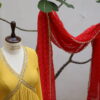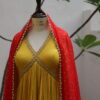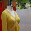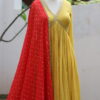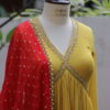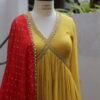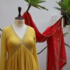 This dress is a vibrant mustard yellow Anarkali-style outfit with intricate golden embroidery along the deep V-neckline and empire waist, adding a regal touch. The pleated flare gives it an elegant and flowing silhouette, perfect for festive or formal occasions. The fabric appears lightweight and textured, enhancing the overall graceful drape. Paired with a contrasting red dupatta adorned with gold sequins and borders, the ensemble exudes traditional with a modern aesthetic.