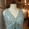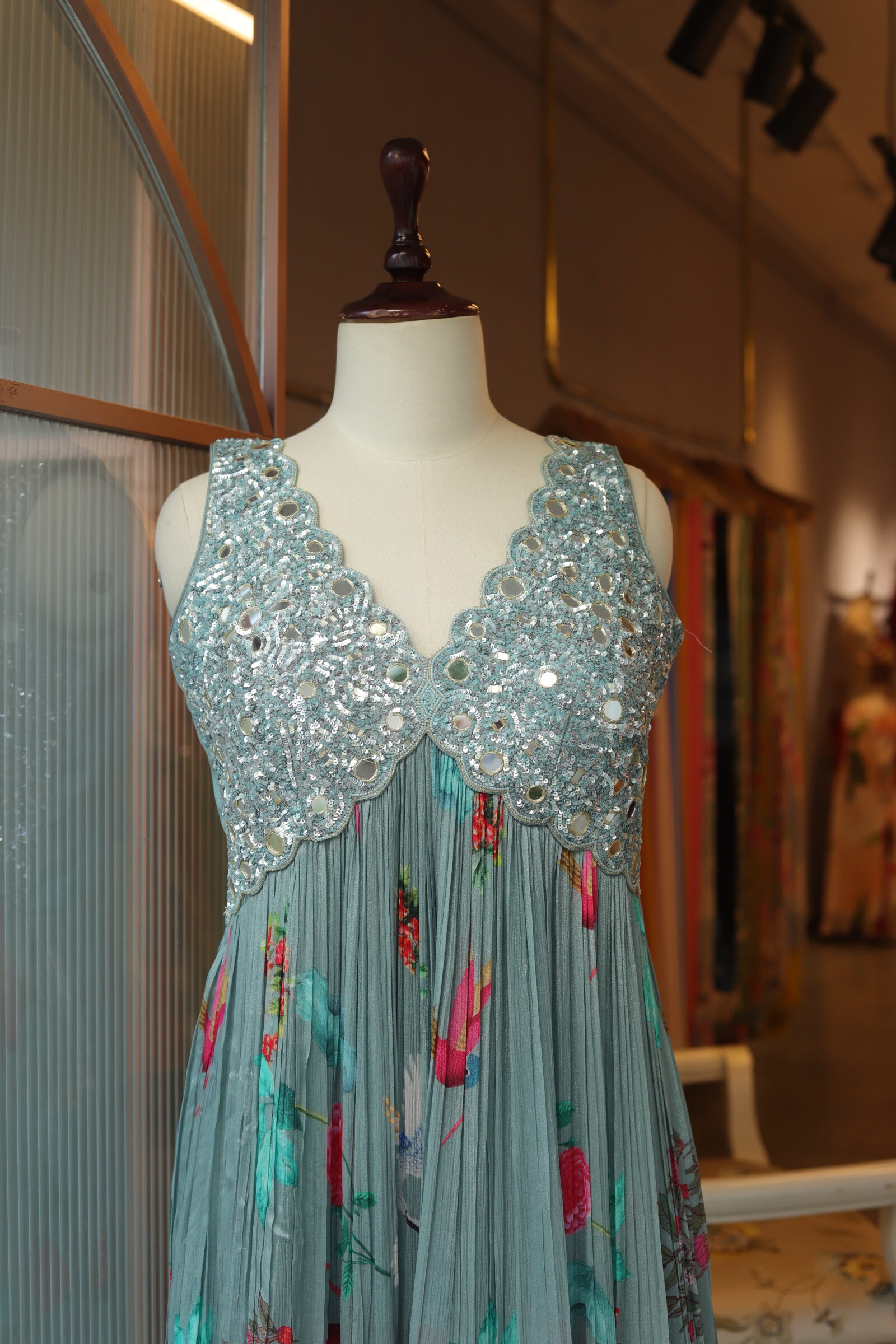 The yoke is exquisitely hand-crafted, adorned with intricate sequence and mirror work, finished with a delicate scalloped design that adds a touch of regal charm.